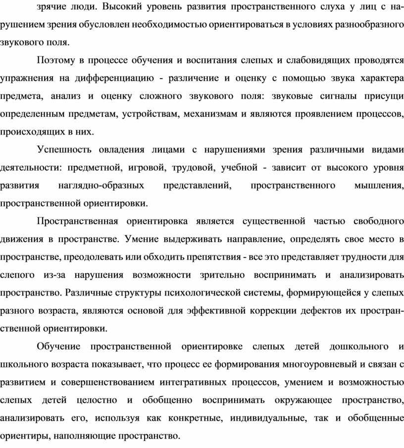 Обучение пространственной ориентировке слепых детей дошкольного и школьного возраста показывает, что процесс ее формирования многоуровневый и связан с развитием и совершенствованием интегративных процессов, умением и возможностью слепых детей целостно и обобщенно воспринимать окружающее пространство, анализировать его, используя как конкретные, индивидуальные, так и обобщенные ориентиры, наполняющие пространство.