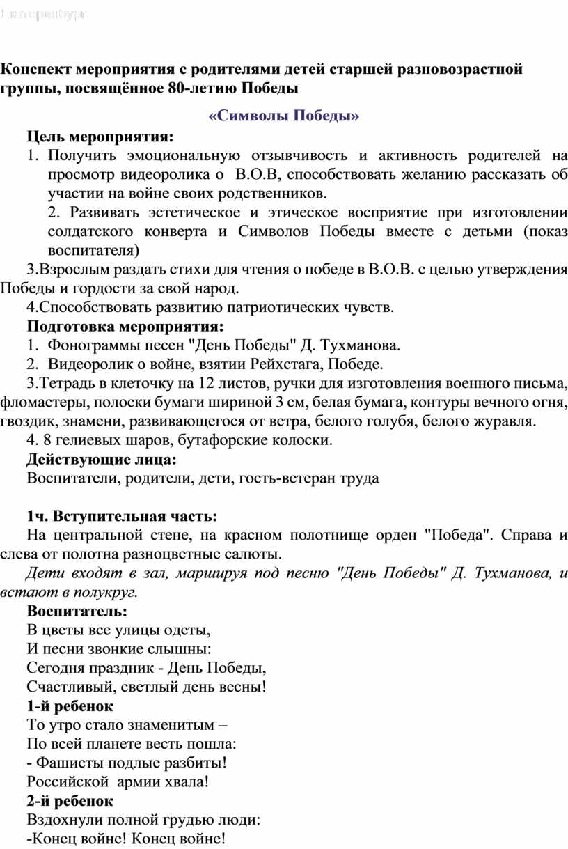 Конспект мероприятия с родителями детей старшей разновозрастной группы, посвящённое 80-летию Победы