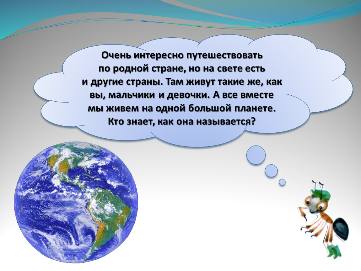 Очень интересно путешествовать по родной стране, но на свете есть и другие страны. Там живут такие же, как вы, мальчики и девочки. А все вместе мы живем на одной большой планете. Кто знает, как она называется?
