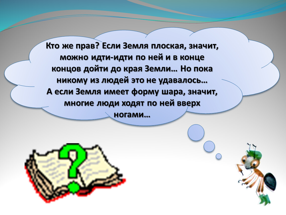 Кто же прав? Если Земля плоская, значит, можно идти-идти по ней и в конце концов дойти до края Земли… Но пока никому из людей это не удавалось… А если Земля имеет форму шара, значит, многие люди ходят по ней вверх ногами…