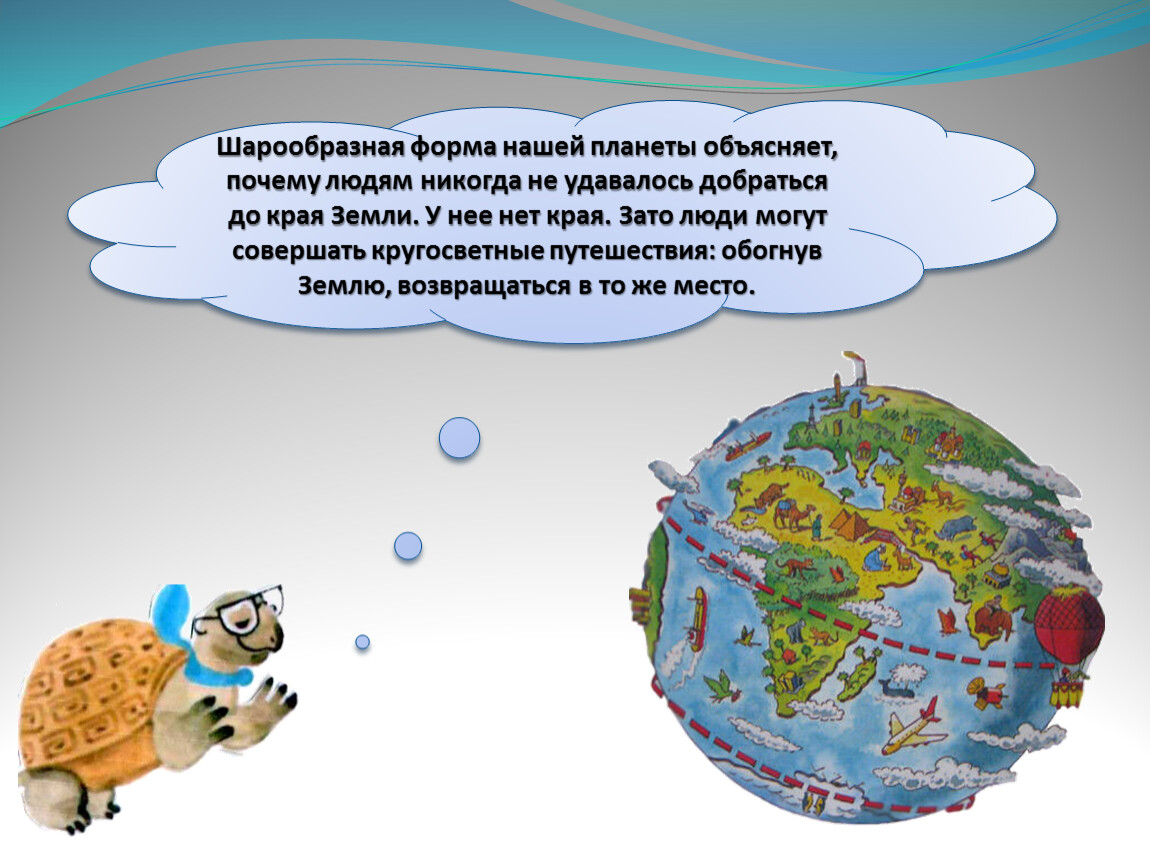 Шарообразная форма нашей планеты объясняет, почему людям никогда не удавалось добраться до края Земли. У нее нет края. Зато люди могут совершать кругосветные путешествия: обогнув Землю, возвращаться в то же место.