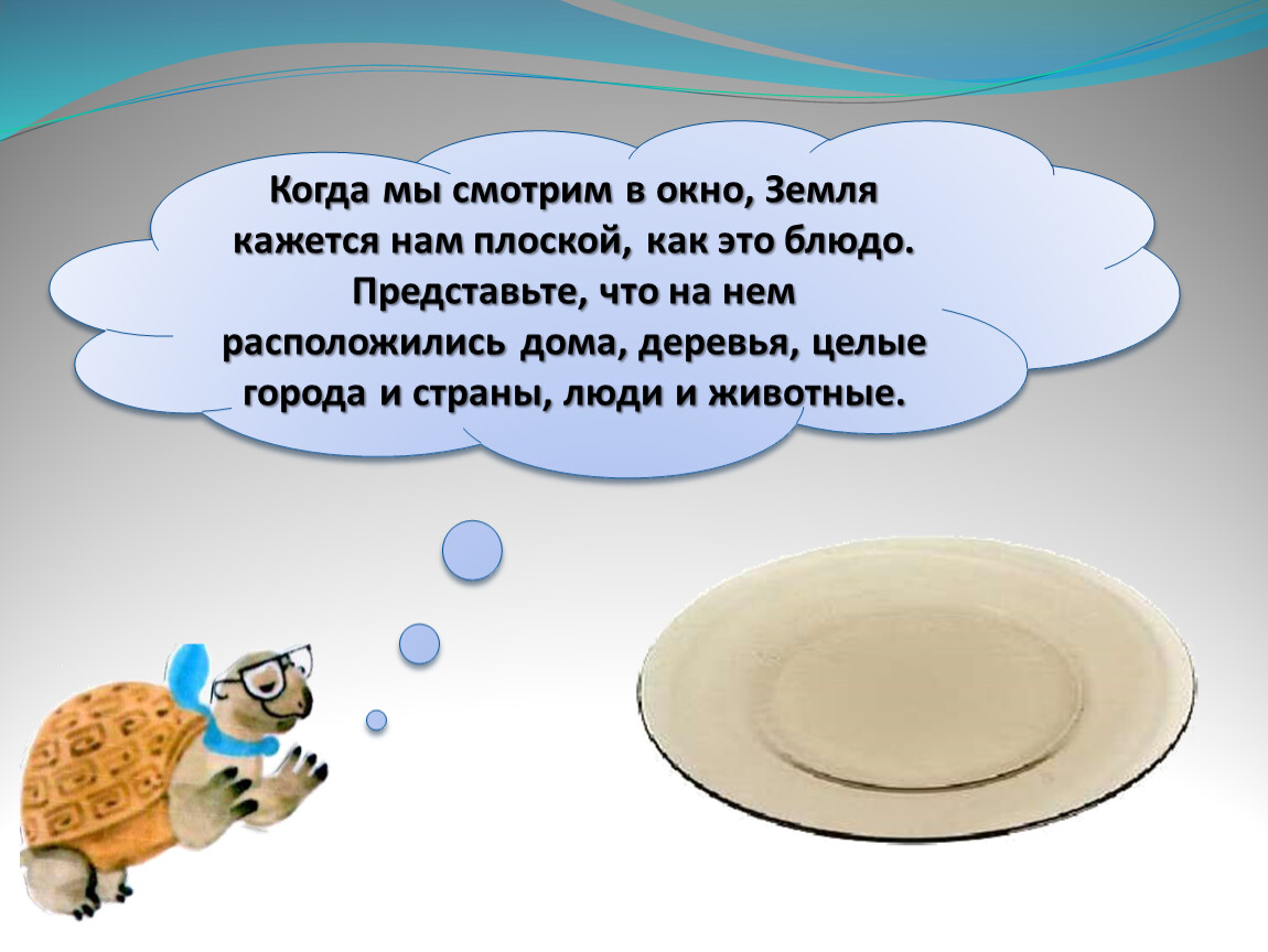 Когда мы смотрим в окно, Земля кажется нам плоской, как это блюдо. Представьте, что на нем расположились дома, деревья, целые города и страны, люди и животные.