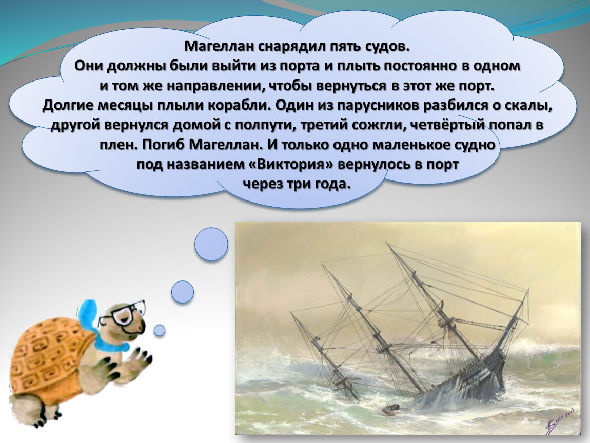 Долгие месяцы плыли корабли. Один из парусников разбился о скалы, другой вернулся домой с полпути, третий сожгли, четвёртый попал в плен. Погиб Магеллан. И только одно маленькое судно