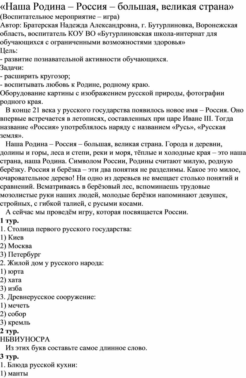 Наша Родина – Россия – большая, великая страна. Города и деревни, долины и горы, леса и степи, реки и моря, тёплые и холодные края – это наша страна, наша Родина. Символом России, Родины считают милую, родную берёзку. Россия и берёзка – эти два понятия не разделимы. Какое это милое, очаровательное дерево! Ни одно из деревьев не вмещает столько понятий и сравнений. Всматриваясь в берёзовый лес, вспоминаешь трудовые мозолистые руки наших людей, молодые берёзки напоминают девушек, стройных, с гибкой талией, с русыми косами.