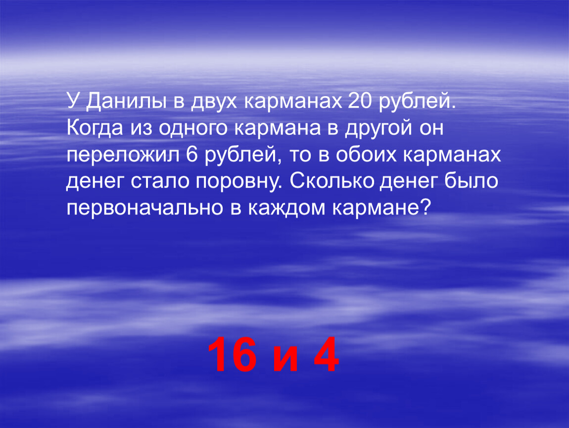 У Данилы в двух карманах 20 рублей. Когда из одного кармана в другой он переложил 6 рублей, то в обоих карманах денег стало поровну. Сколько денег было первоначально в каждом кармане?