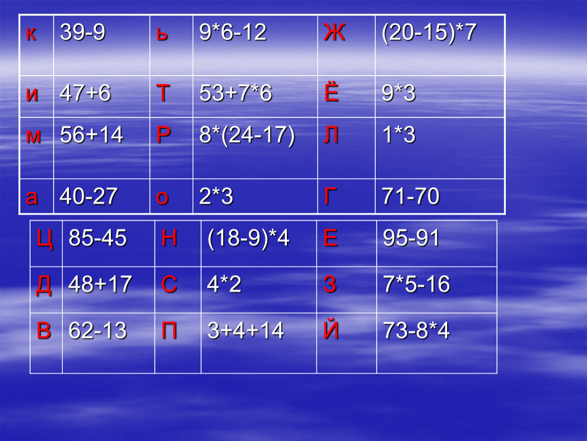 к | 39-9 | ь | 9*6-12 | Ж | (20-15)*7 |