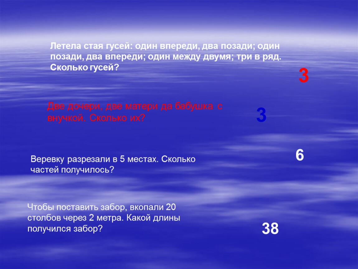 Летела стая гусей: один впереди, два позади; один позади, два впереди; один между двумя; три в ряд. Сколько гусей?