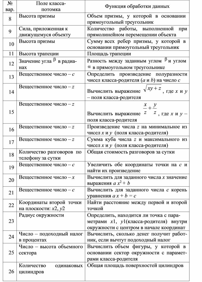 - функцию обработки данных, указанную в индивидуальном задании (табл 11.4, столб 3).