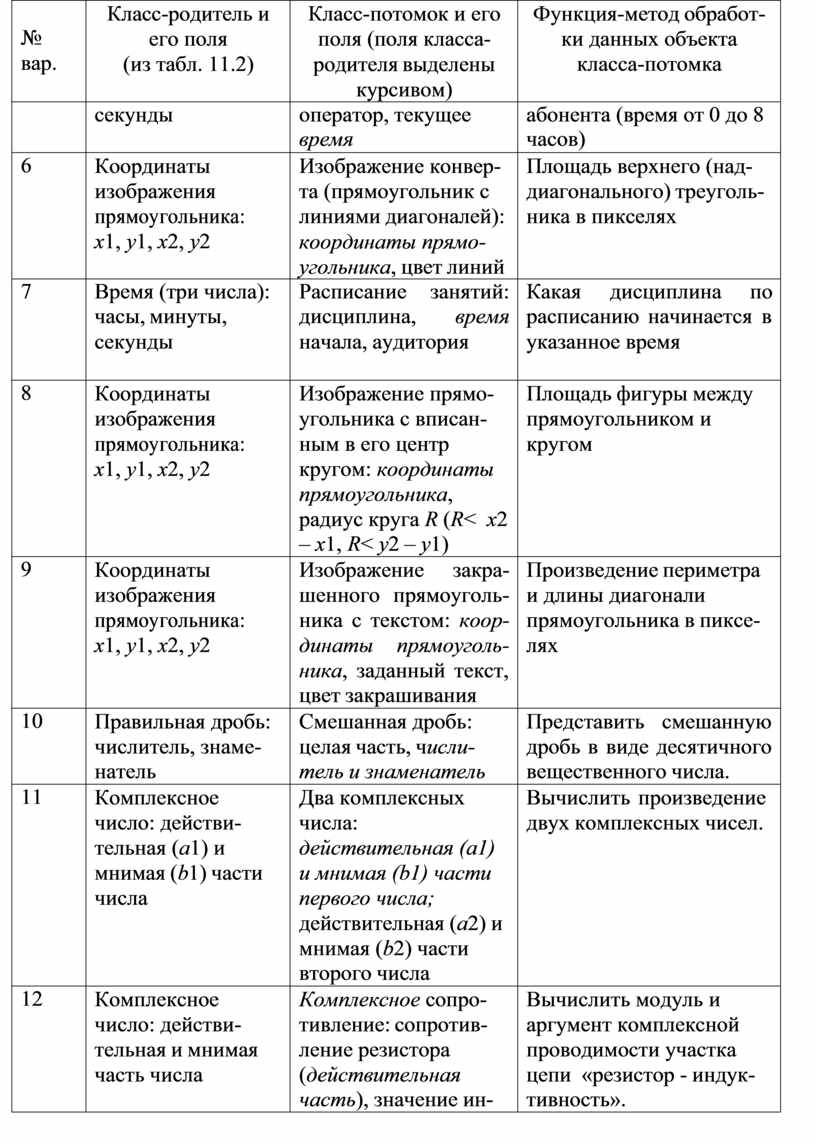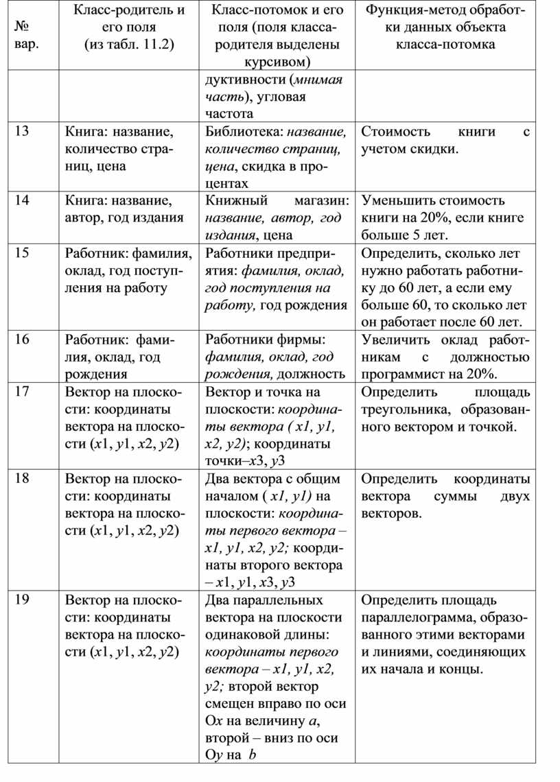 Задание: Для класса, созданного в предыдущем задании (по вариантам табл. 10.1) создать класс-потомок с дополнительным полем, указанным в индивидуальном задании (табл. 11.4, столб 2).