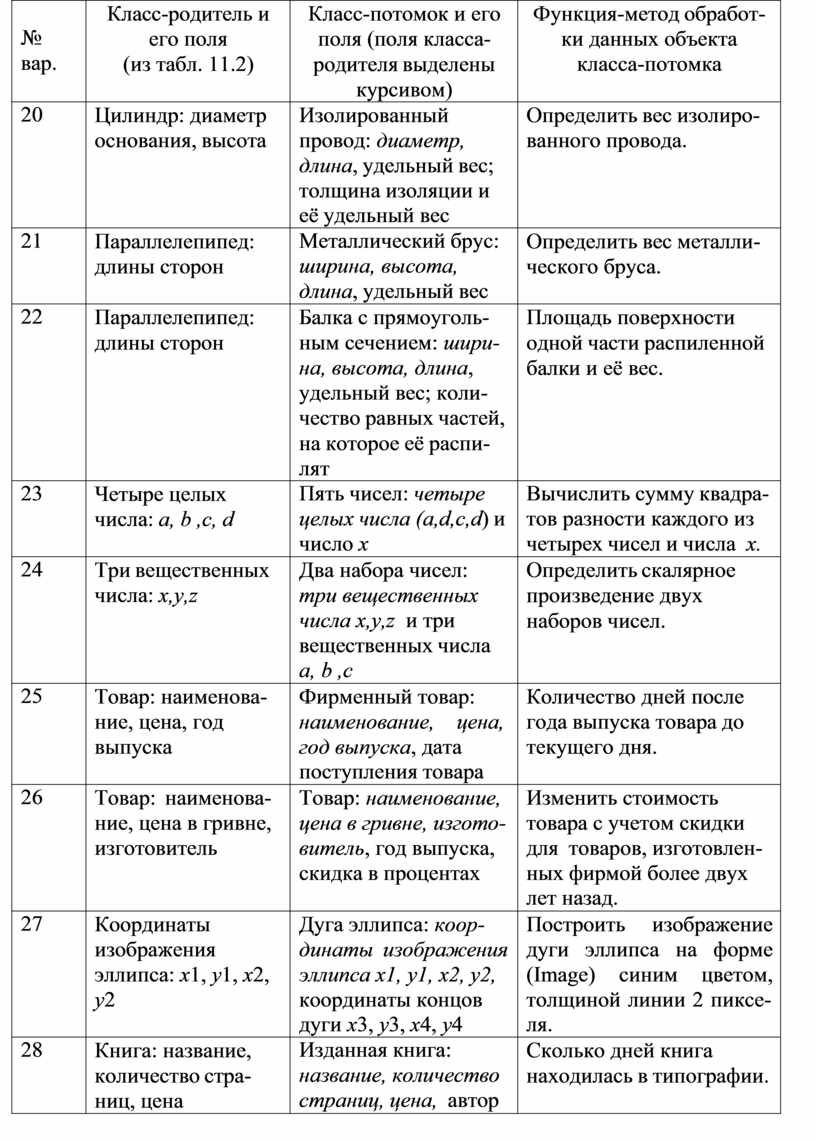 Таблица 11.4 – Варианты индивидуальных заданий