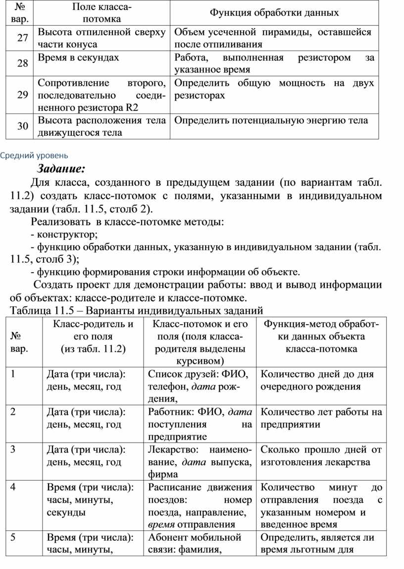 Для класса, созданного в предыдущем задании (по вариантам табл. 11.2) создать класс-потомок с полями, указанными в индивидуальном задании (табл. 11.5, столб 2).