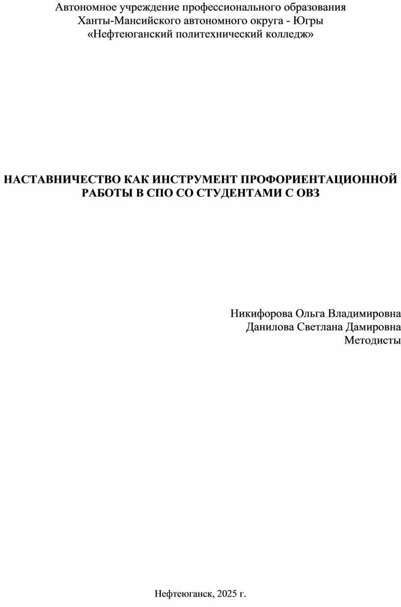 Наставничество – это мощный инструмент, который играет ключевую роль в профориентации и успешной интеграции студентов с ОВЗ в образовательную среду и общество. Организованное наставничество, учитывающее специфику потребностей и особенностей студентов с ОВЗ, позволяет им сделать осознанный выбор профессии, развить необходимые компетенции и построить успешное будущее. АУ «Нефтеюганский политехнический колледж», внедряя эффективные программы наставничества, вносит значительный вклад в профессиональное становление и социальную адаптацию студентов с ОВЗ.