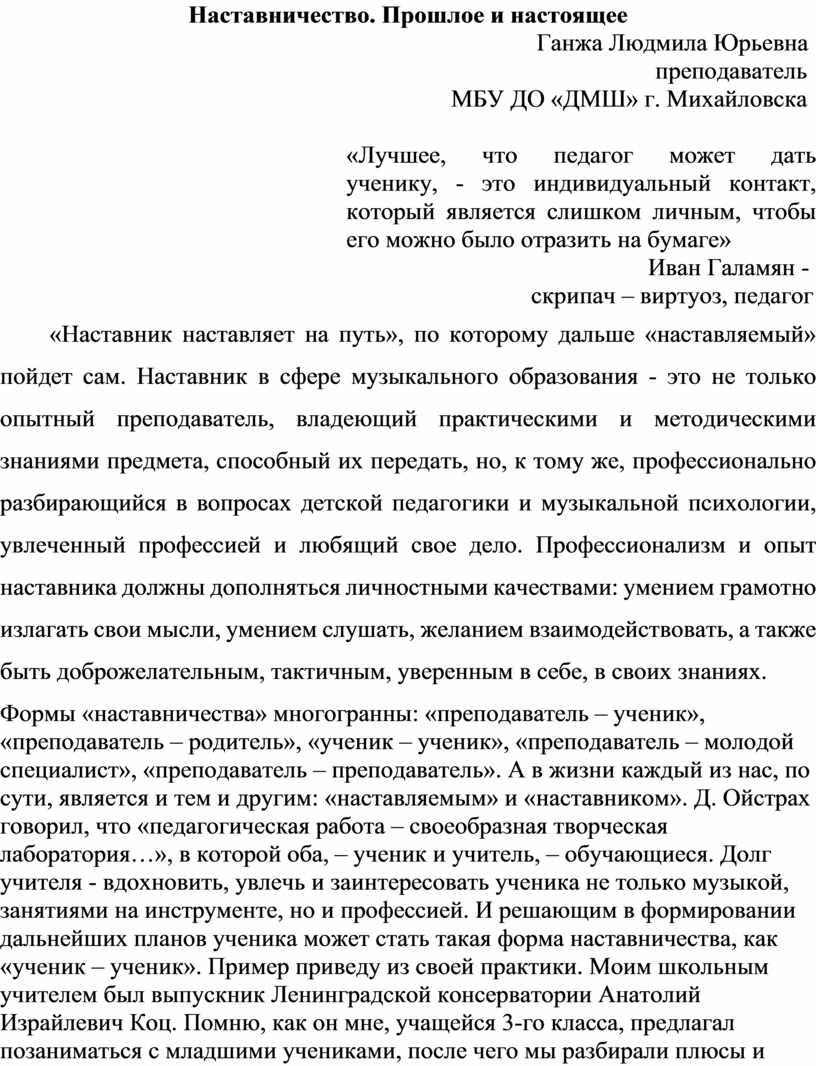 Формы «наставничества» многогранны: «преподаватель – ученик», «преподаватель – родитель», «ученик – ученик», «преподаватель – молодой специалист», «преподаватель – преподаватель». А в жизни каждый из нас, по сути, является и тем и другим: «наставляемым» и «наставником». Д. Ойстрах говорил, что «педагогическая работа – своеобразная творческая лаборатория…», в которой оба, – ученик и учитель, – обучающиеся. Долг учителя - вдохновить, увлечь и заинтересовать ученика не только музыкой, занятиями на инструменте, но и профессией. И решающим в формировании дальнейших планов ученика может стать такая форма наставничества, как «ученик – ученик». Пример приведу из своей практики. Моим школьным учителем был выпускник Ленинградской консерватории Анатолий Израйлевич Коц. Помню, как он мне, учащейся 3-го класса, предлагал позаниматься с младшими учениками, после чего мы разбирали плюсы и минусы, а по окончании учебного года Анатолий Израйлевич велел заниматься с девочкой на летних каникулах, что и было сделано с большим удовольствием! Мне, признаюсь, повезло с покладистой ученицей. Мы занимались по-настоящему: добросовестно, с расписанием, заданиями в дневнике и оценками. Так было сформировано учителем желание учить детей, которое перевесило прочие мои интересы и по окончании школы выбор был сделан в пользу музыкального училища. Надо сказать, что А.И. Коц дал путевку в профессию своим выпускникам, которые, в своем большинстве, стали профессиональными музыкантами, преподавателями.