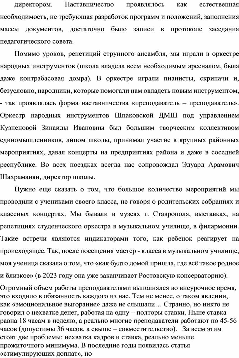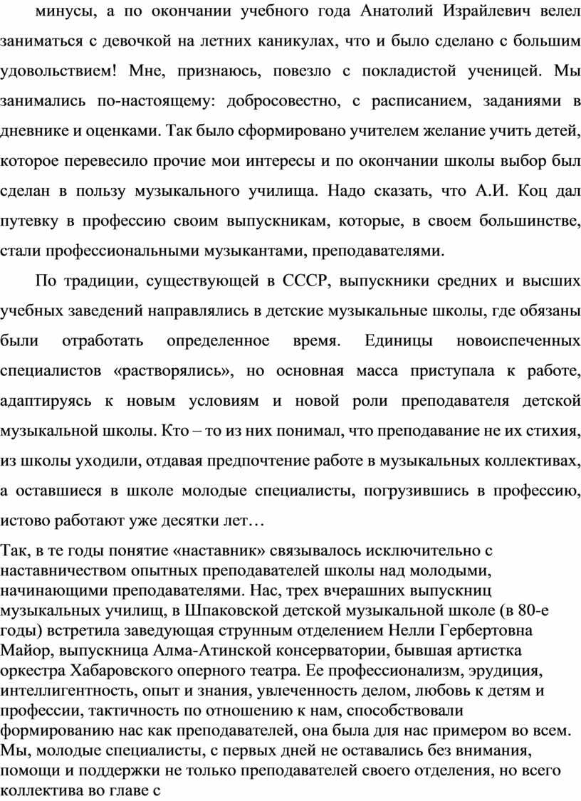 Так, в те годы понятие «наставник» связывалось исключительно с наставничеством опытных преподавателей школы над молодыми, начинающими преподавателями. Нас, трех вчерашних выпускниц музыкальных училищ, в Шпаковской детской музыкальной школе (в 80-е годы) встретила заведующая струнным отделением Нелли Гербертовна Майор, выпускница Алма-Атинской консерватории, бывшая артистка оркестра Хабаровского оперного театра. Ее профессионализм, эрудиция, интеллигентность, опыт и знания, увлеченность делом, любовь к детям и профессии, тактичность по отношению к нам, способствовали формированию нас как преподавателей, она была для нас примером во всем. Мы, молодые специалисты, с первых дней не оставались без внимания, помощи и поддержки не только преподавателей своего отделения, но всего коллектива во главе с директором. Наставничество проявлялось как естественная необходимость, не требующая разработок программ и положений, заполнения массы документов, достаточно было записи в протоколе заседания педагогического совета.