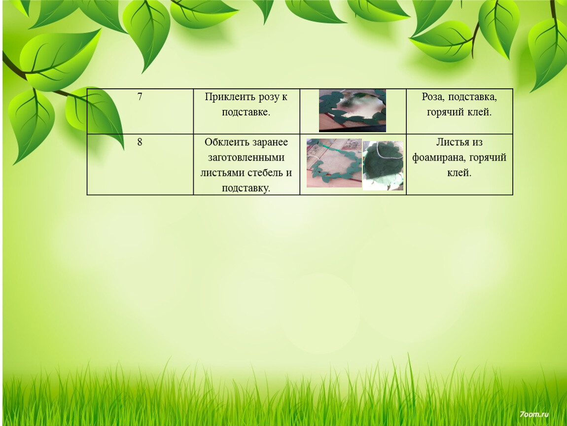 8 | Обклеить заранее заготовленными листьями стебель и подставку. | Листья из фоамирана, горячий клей. |
