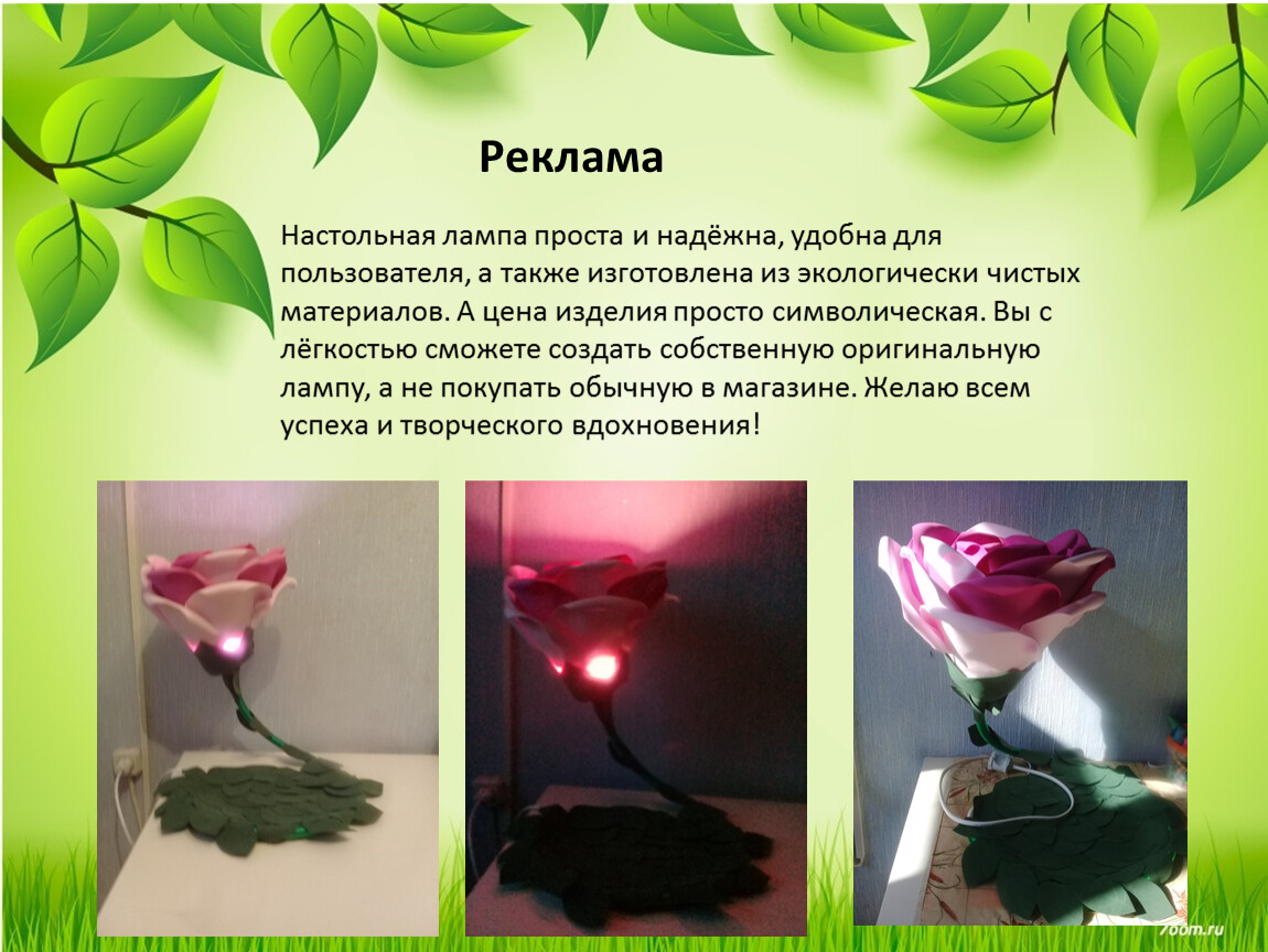 Настольная лампа проста и надёжна, удобна для пользователя, а также изготовлена из экологически чистых материалов. А цена изделия просто символическая. Вы с лёгкостью сможете создать собственную оригинальную лампу, а не покупать обычную в магазине. Желаю всем успеха и творческого вдохновения!
