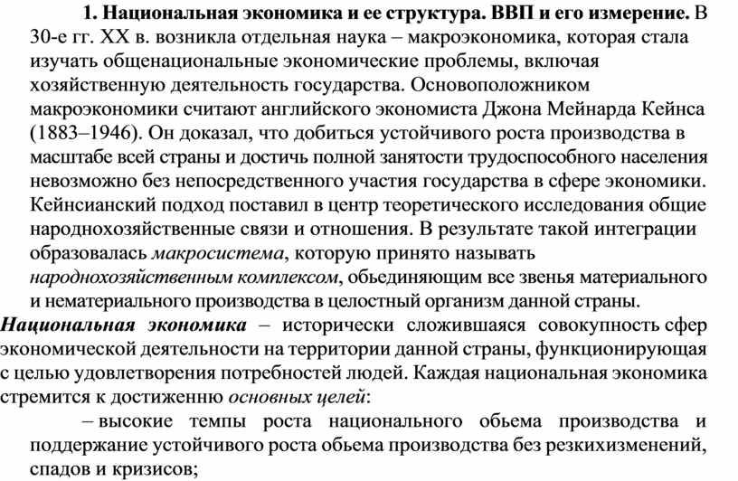 1. Национальная экономика и ее структура. ВВП и его измерение. В 30-е гг. XX в. возникла отдельная наука – макроэкономика, которая стала изучать общенациональные экономические проблемы, включая хозяйственную деятельность государства. Основоположником макроэкономики считают английского экономиста Джона Мейнарда Кейнса (1883–1946). Он доказал, что добиться устойчивого роста производства в масштабе всей страны и достичь полной занятости трудоспособного населения невозможно без непосредственного участия государства в сфере экономики. Кейнсианский подход поставил в центр теоретического исследования общие народнохозяйственные связи и отношения. В результате такой интеграции образовалась макросистема, которую принято называть народнохозяйственным комплексом, обьединяющим все звенья материального и нематериального производства в целостный организм данной страны.