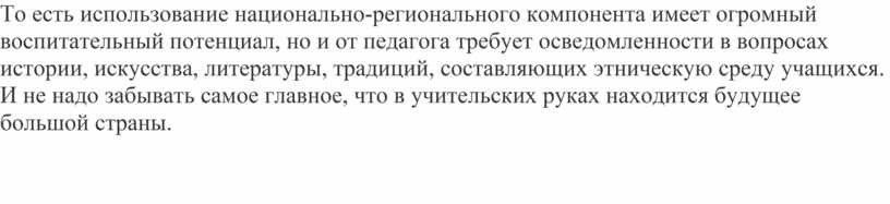 То есть использование национально-регионального компонента имеет огромный воспитательный потенциал, но и от педагога требует осведомленности в вопросах истории, искусства, литературы, традиций, составляющих этническую среду учащихся. И не надо забывать самое главное, что в учительских руках находится будущее большой страны.