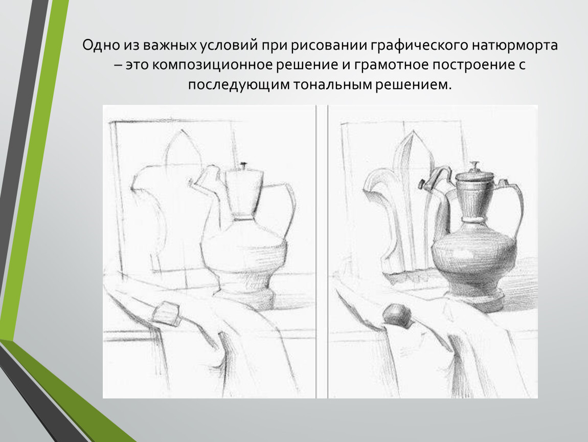 Одно из важных условий при рисовании графического натюрморта – это композиционное решение и грамотное построение с последующим тональным решением.