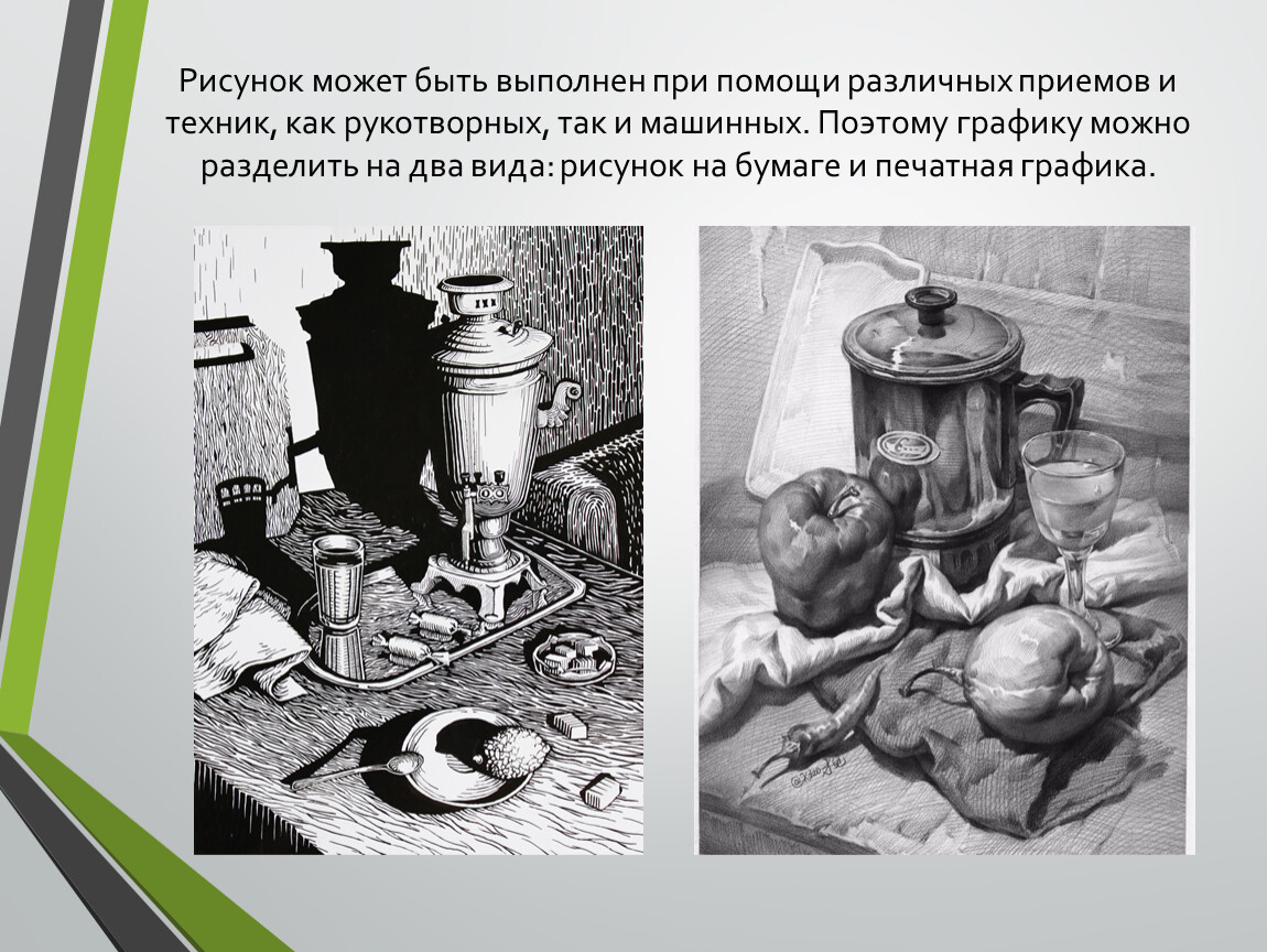 Рисунок может быть выполнен при помощи различных приемов и техник, как рукотворных, так и машинных. Поэтому графику можно разделить на два вида: рисунок на бумаге и печатная графика.