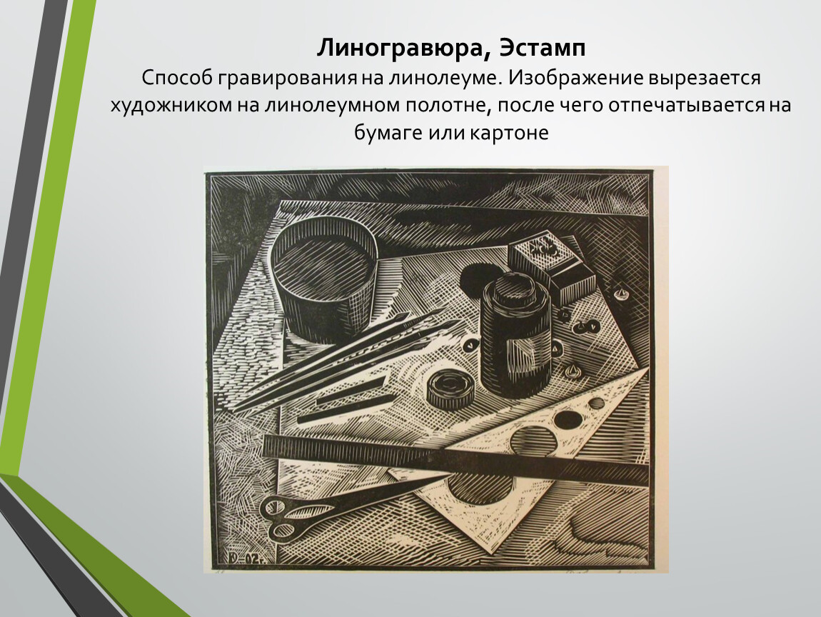 Линогравюра, ЭстампСпособ гравирования на линолеуме. Изображение вырезается художником на линолеумном полотне, после чего отпечатывается на бумаге или картоне