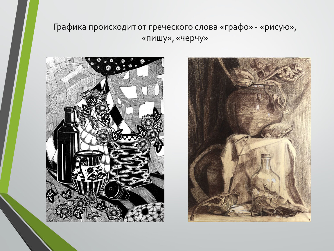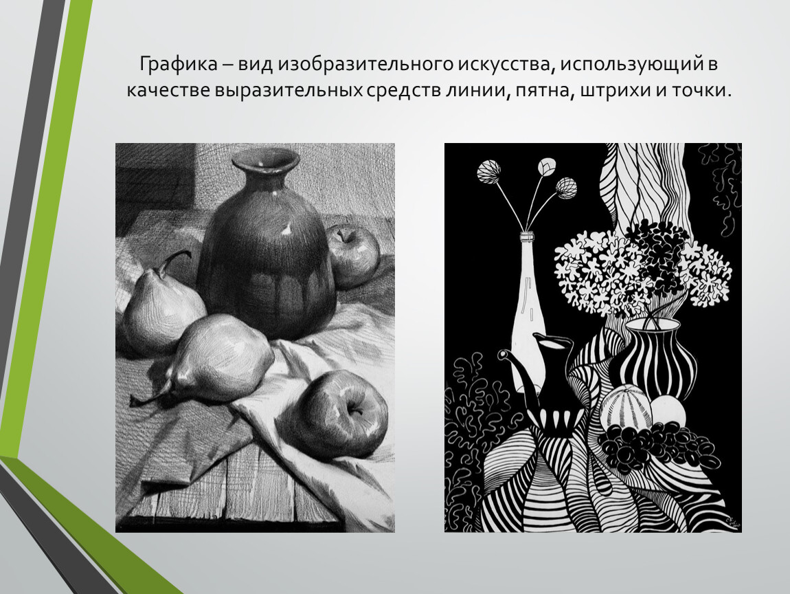 Графика – вид изобразительного искусства, использующий в качестве выразительных средств линии, пятна, штрихи и точки.