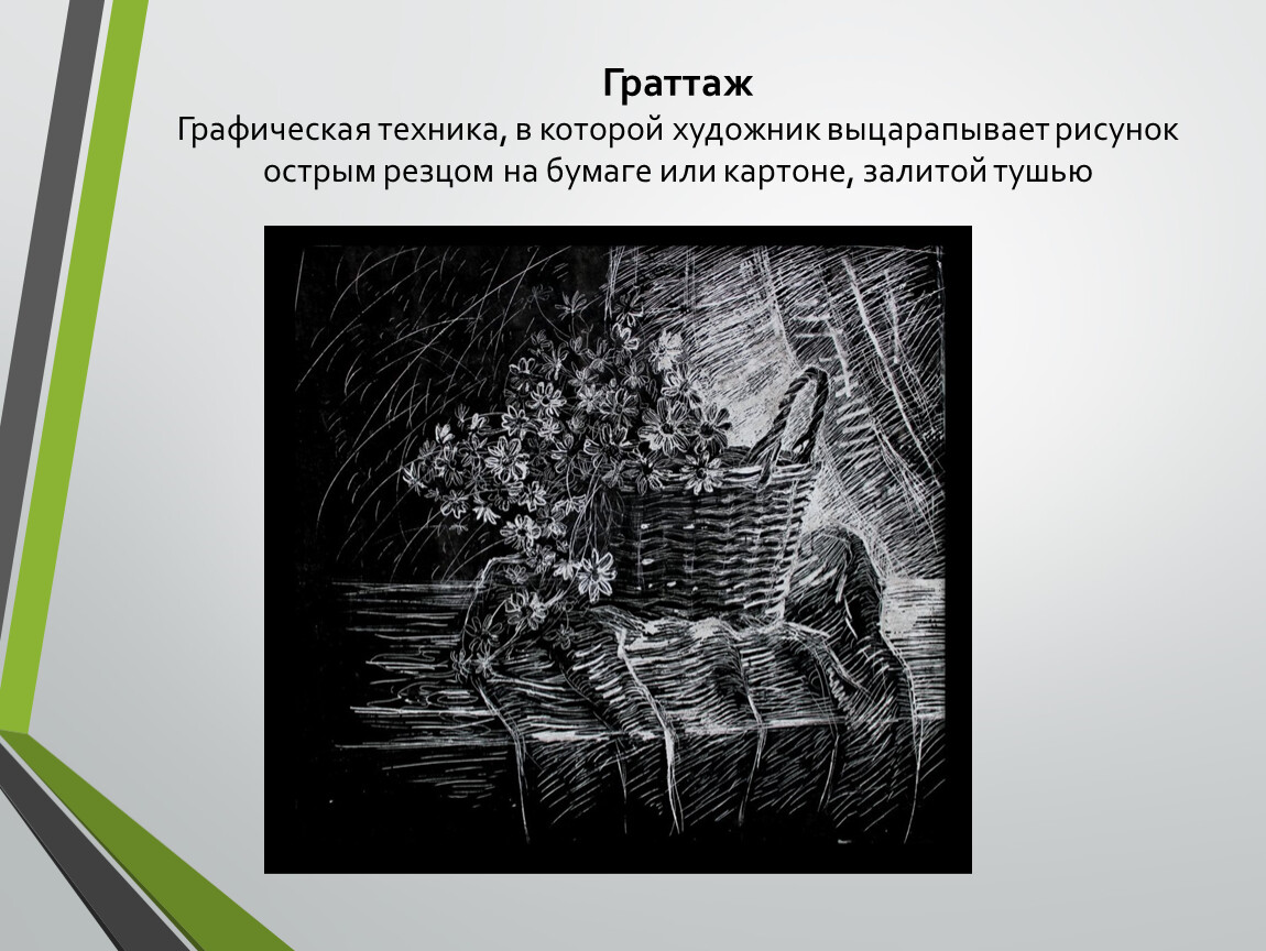 ГраттажГрафическая техника, в которой художник выцарапывает рисунок острым резцом на бумаге или картоне, залитой тушью