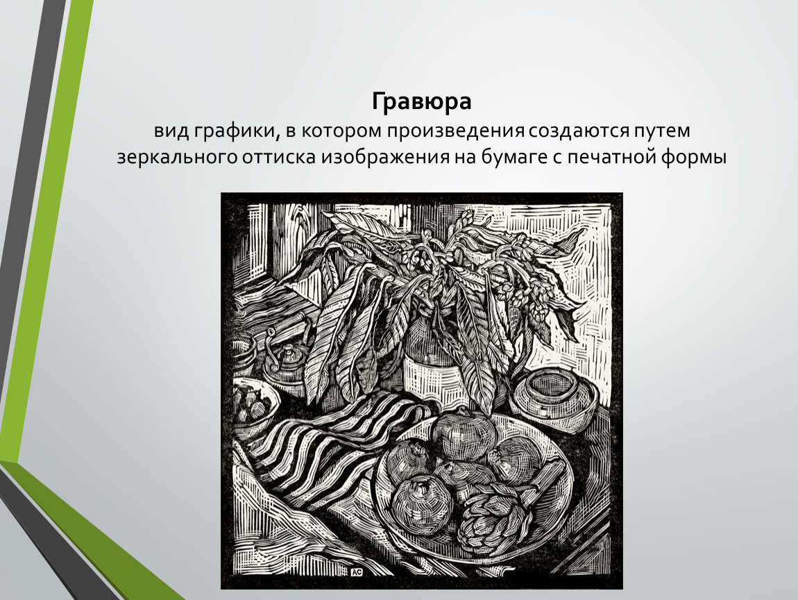 Гравюравид графики, в котором произведения создаются путем зеркального оттиска изображения на бумаге с печатной формы