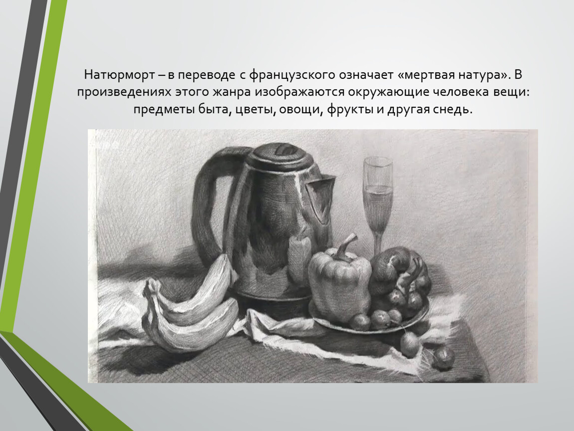 Натюрморт – в переводе с французского означает «мертвая натура». В произведениях этого жанра изображаются окружающие человека вещи: предметы быта, цветы, овощи, фрукты и другая снедь.