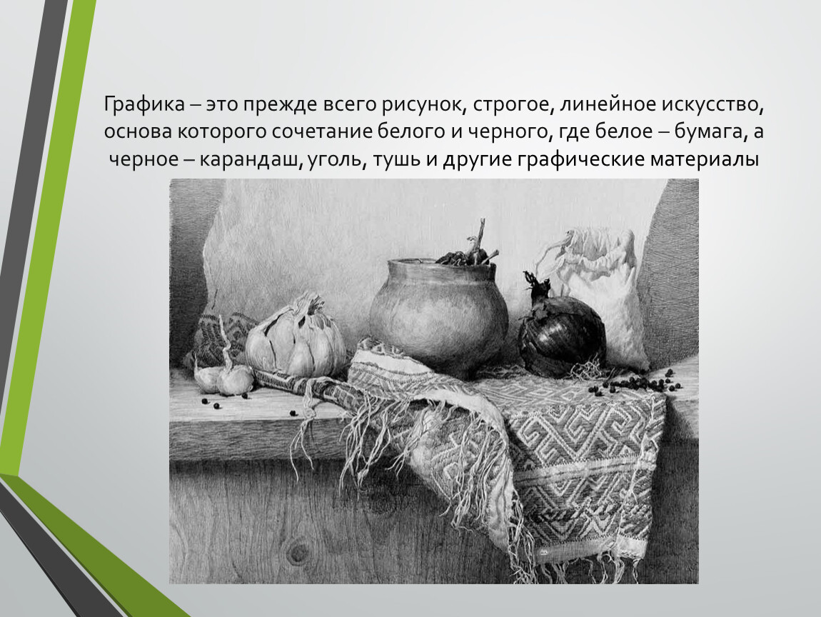 Графика – это прежде всего рисунок, строгое, линейное искусство, основа которого сочетание белого и черного, где белое – бумага, а черное – карандаш, уголь, тушь и другие графические материалы