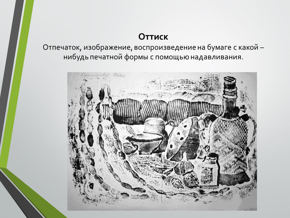 ОттискОтпечаток, изображение, воспроизведение на бумаге с какой – нибудь печатной формы с помощью надавливания.