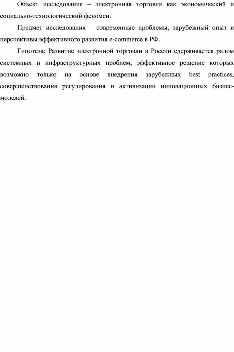 Предмет исследования – современные проблемы, зарубежный опыт и перспективы эффективного развития e-commerce в РФ.