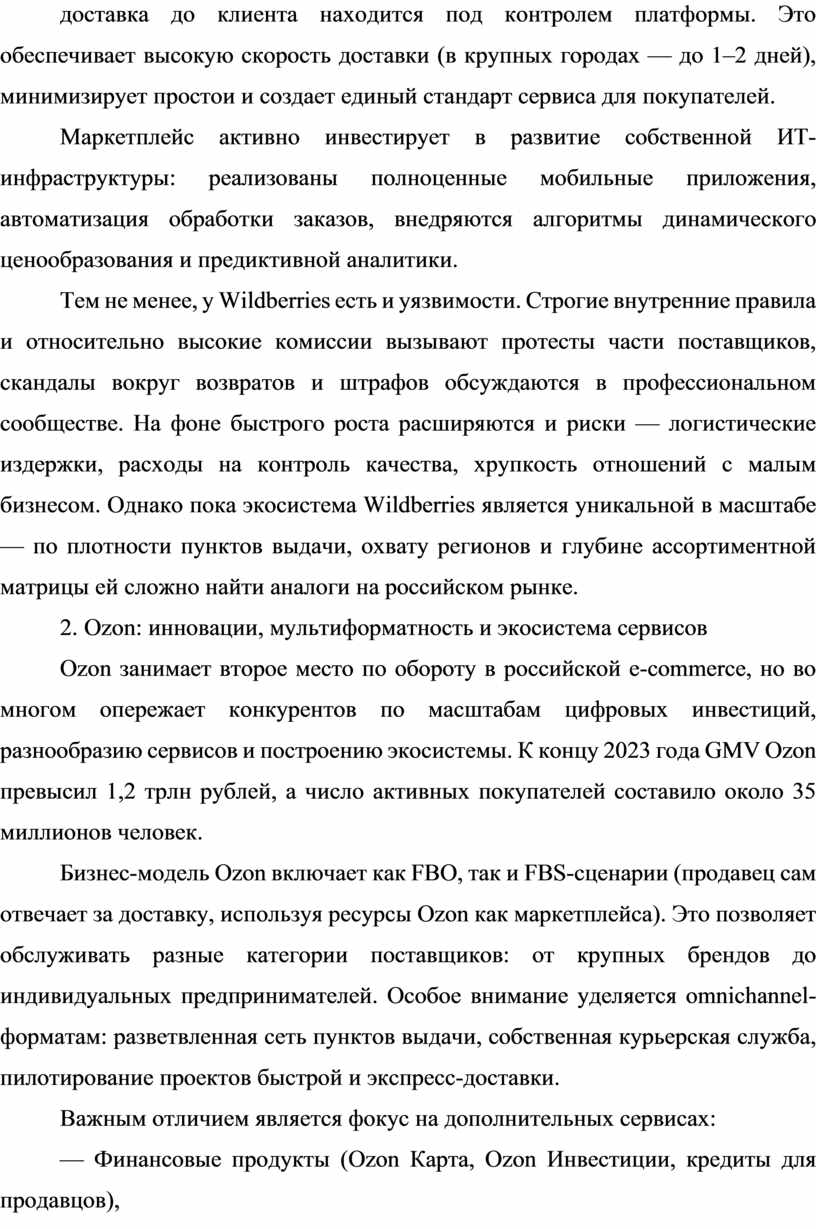 Бизнес-модель Ozon включает как FBO, так и FBS-сценарии (продавец сам отвечает за доставку, используя ресурсы Ozon как маркетплейса). Это позволяет обслуживать разные категории поставщиков: от крупных брендов до индивидуальных предпринимателей. Особое внимание уделяется omnichannel-форматам: разветвленная сеть пунктов выдачи, собственная курьерская служба, пилотирование проектов быстрой и экспресс-доставки.