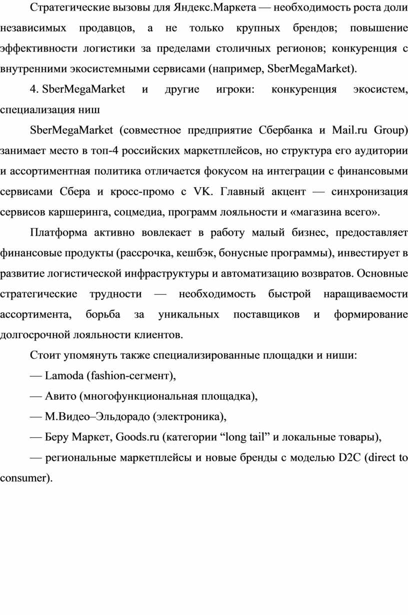 Стратегические вызовы для Яндекс.Маркета — необходимость роста доли независимых продавцов, а не только крупных брендов; повышение эффективности логистики за пределами столичных регионов; конкуренция с внутренними экосистемными сервисами (например, SberMegaMarket).