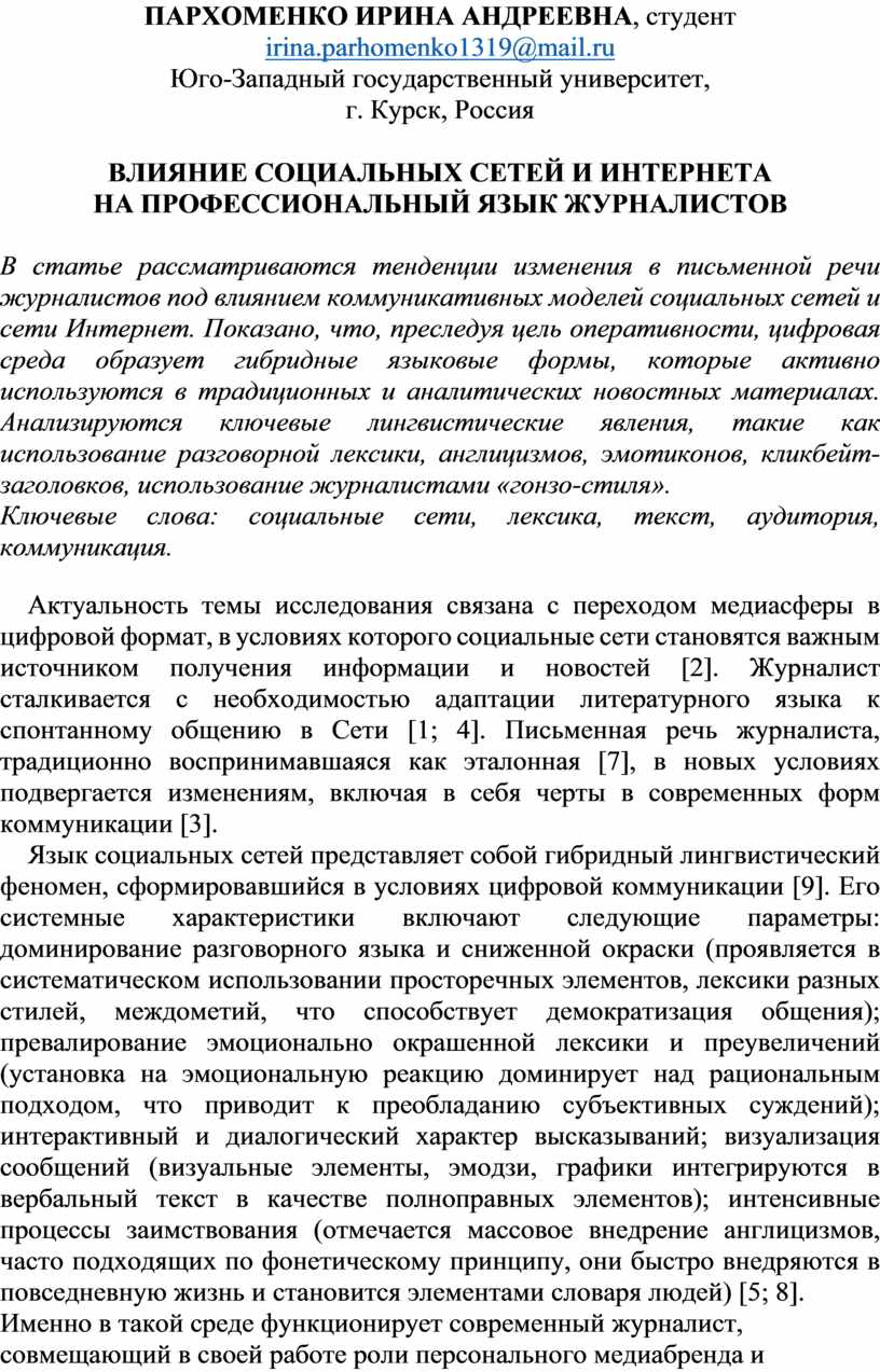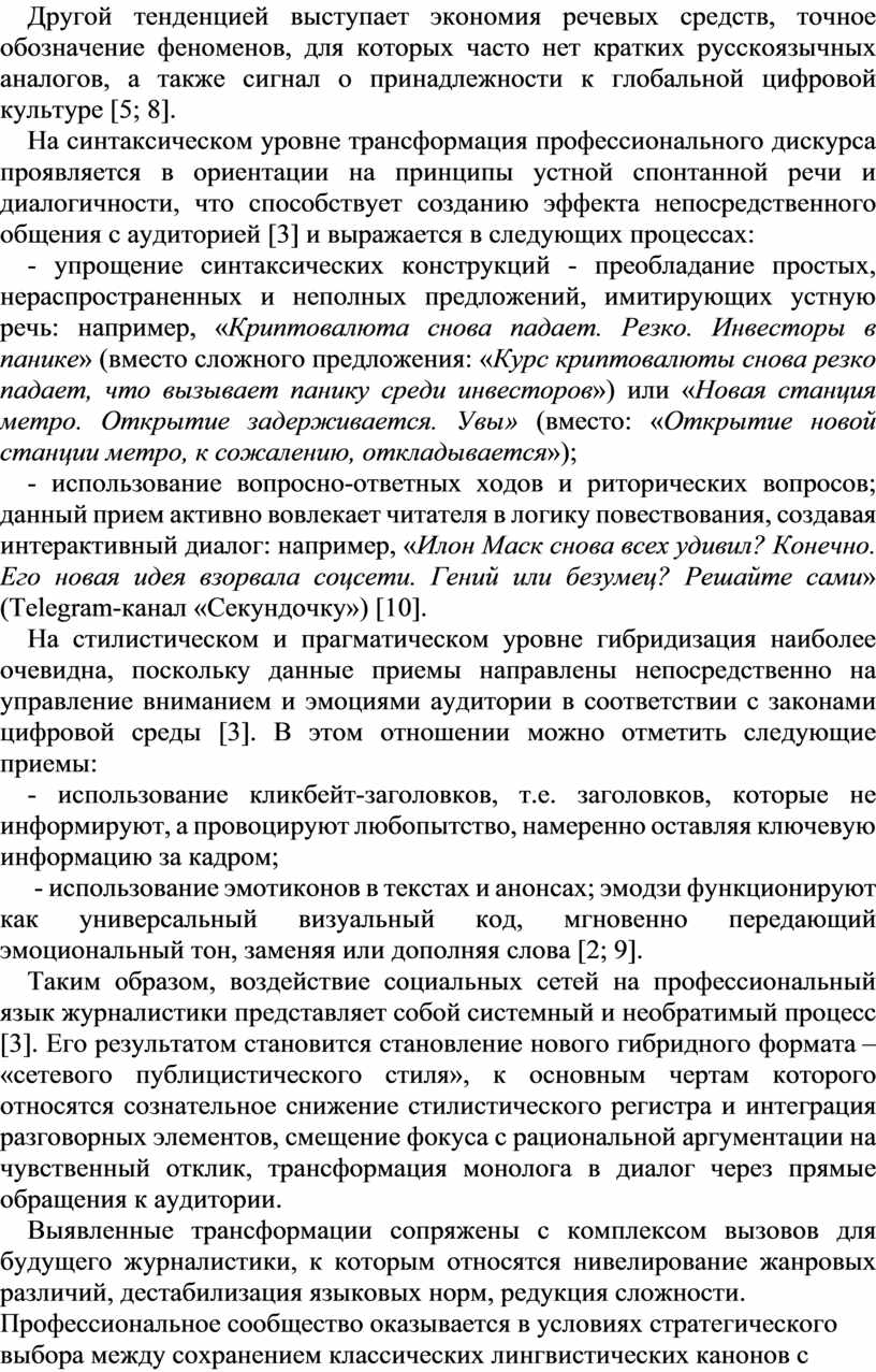 Таким образом, воздействие социальных сетей на профессиональный язык журналистики представляет собой системный и необратимый процесс [3]. Его результатом становится становление нового гибридного формата – «сетевого публицистического стиля», к основным чертам которого относятся сознательное снижение стилистического регистра и интеграция разговорных элементов, смещение фокуса с рациональной аргументации на чувственный отклик, трансформация монолога в диалог через прямые обращения к аудитории.