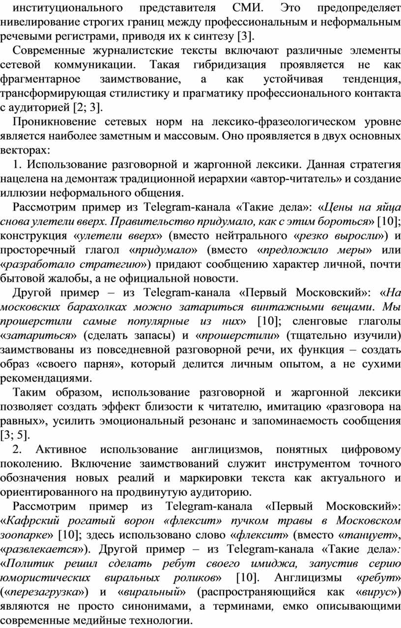 Современные журналистские тексты включают различные элементы сетевой коммуникации. Такая гибридизация проявляется не как фрагментарное заимствование, а как устойчивая тенденция, трансформирующая стилистику и прагматику профессионального контакта с аудиторией [2; 3].