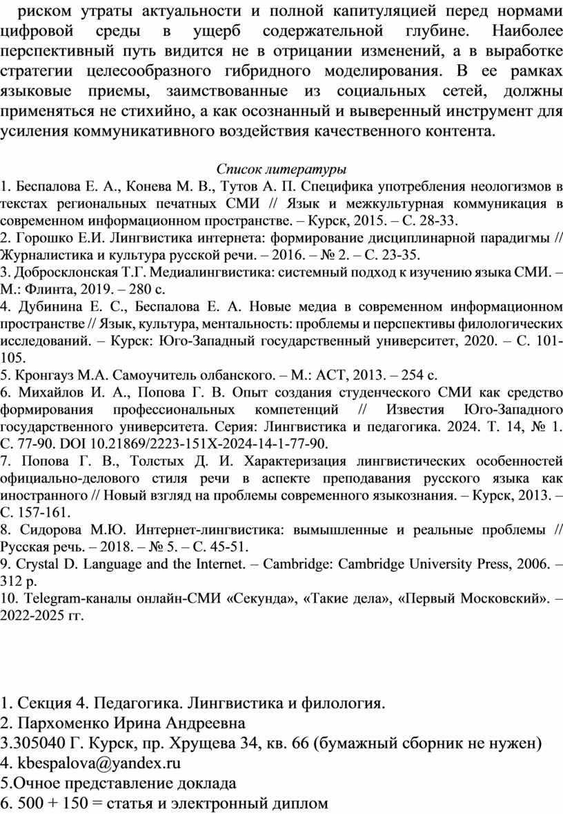 1. Беспалова Е. А., Конева М. В., Тутов А. П. Специфика употребления неологизмов в текстах региональных печатных СМИ // Язык и межкультурная коммуникация в современном информационном пространстве. – Курск, 2015. – С. 28-33.