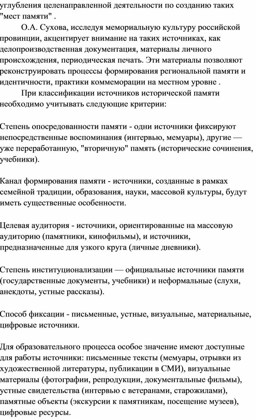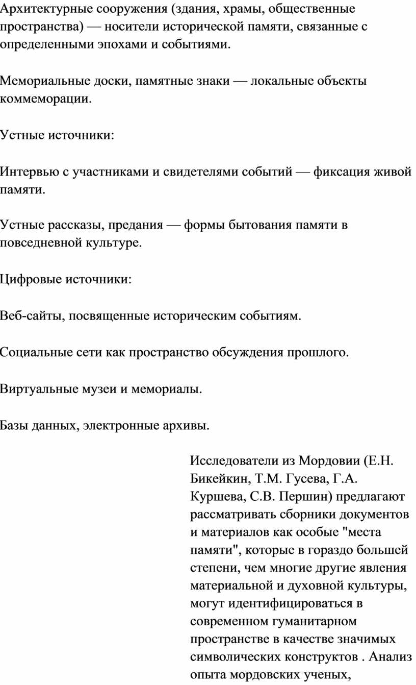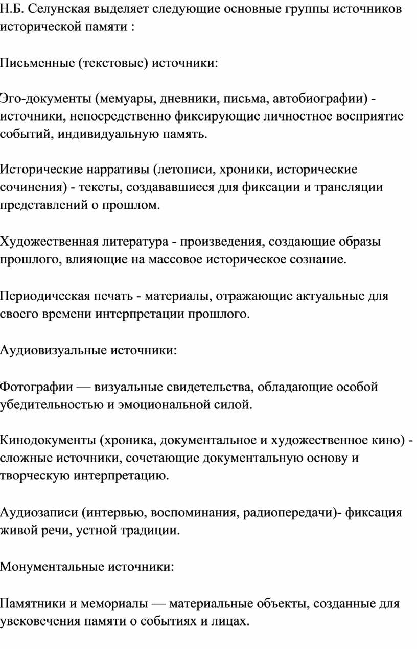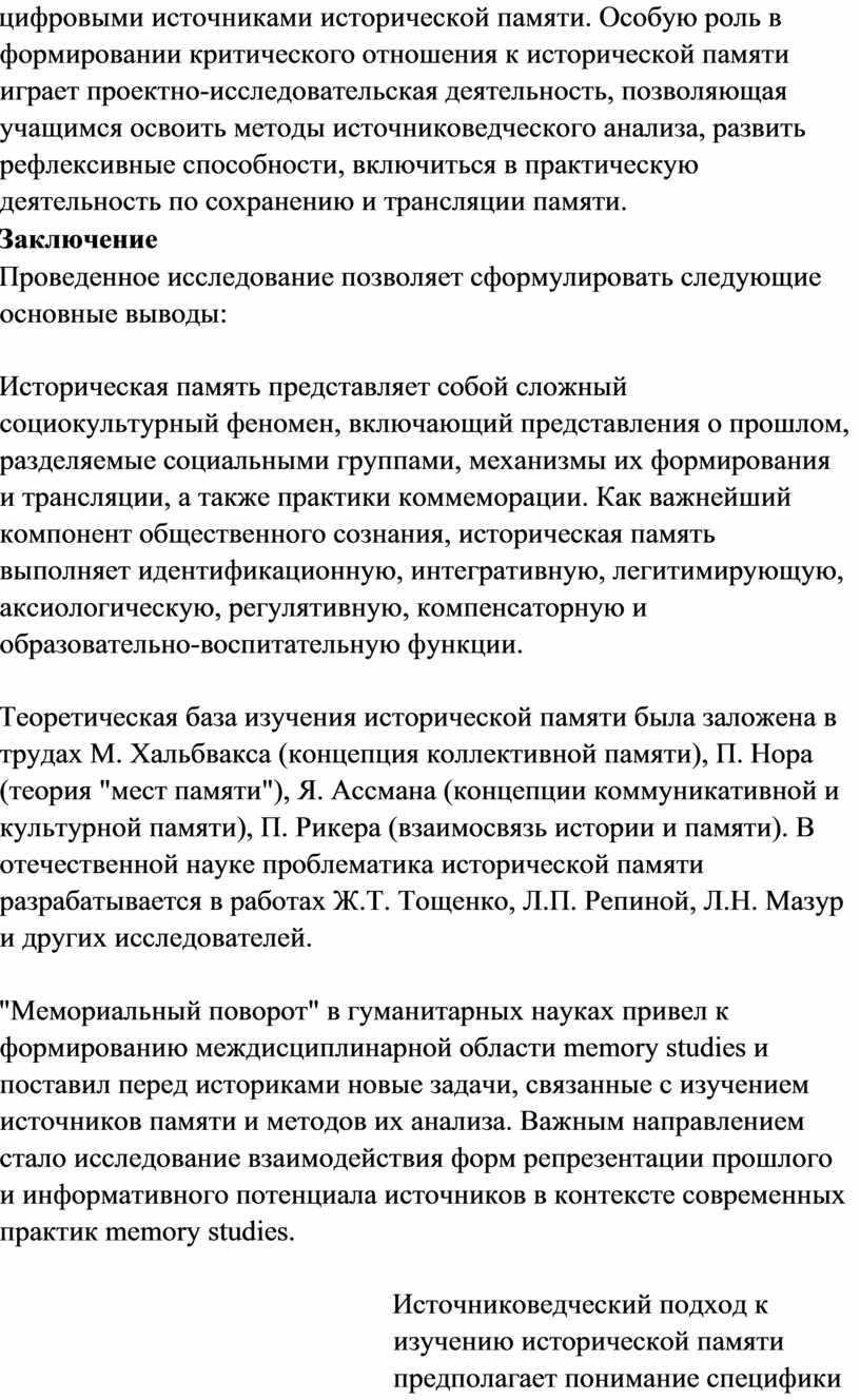 Источниковая база исследования. Источниковую базу составили: 1) теоретические труды по проблемам исторической памяти и источниковедения;