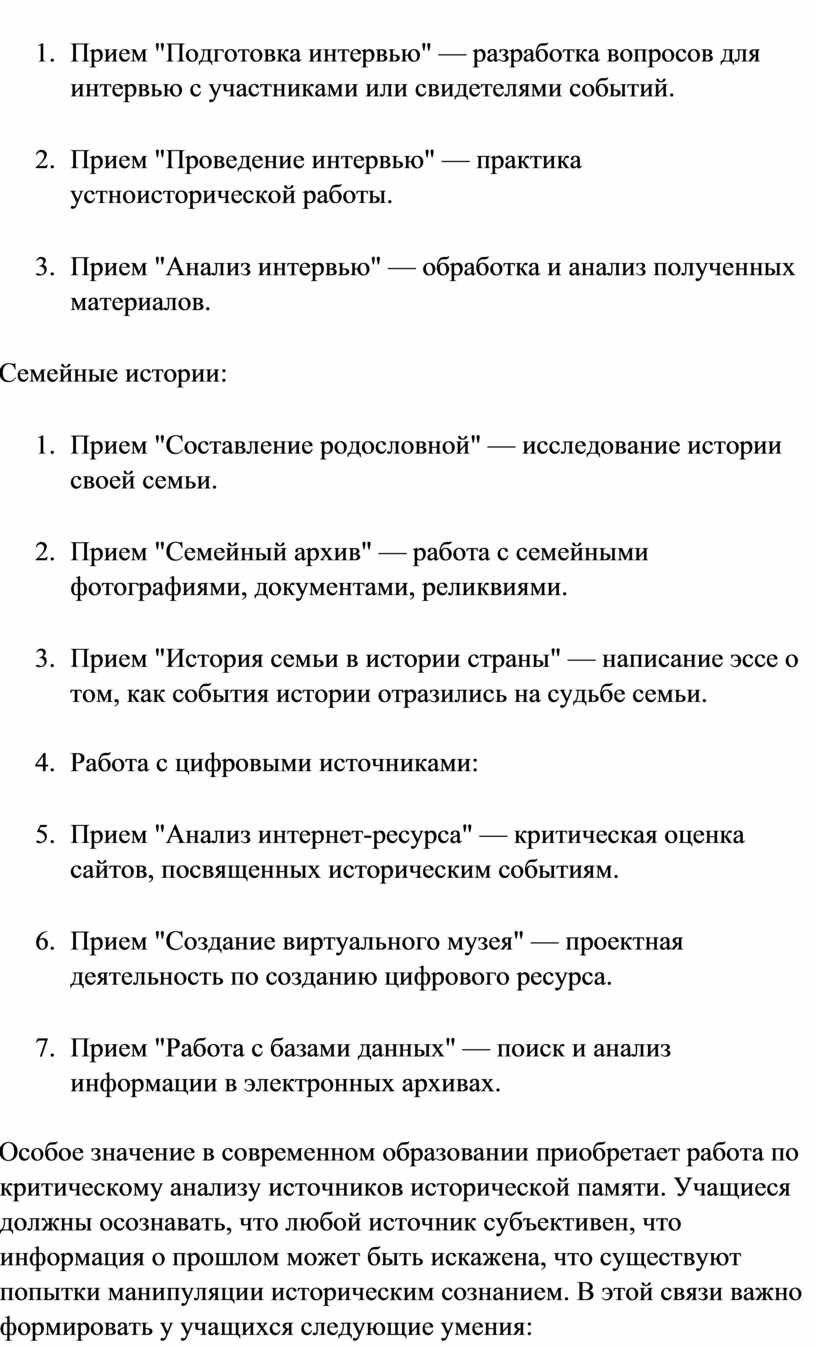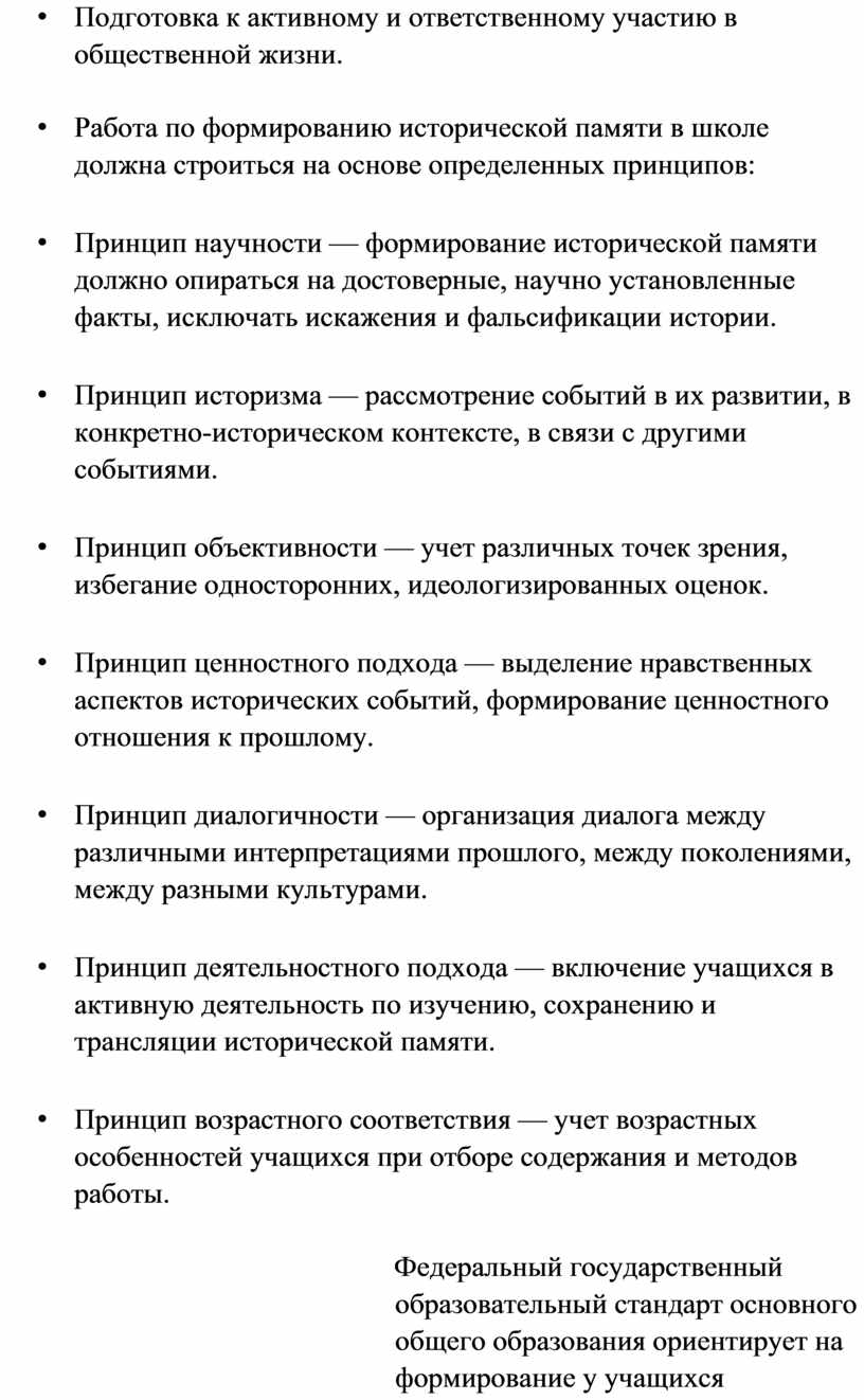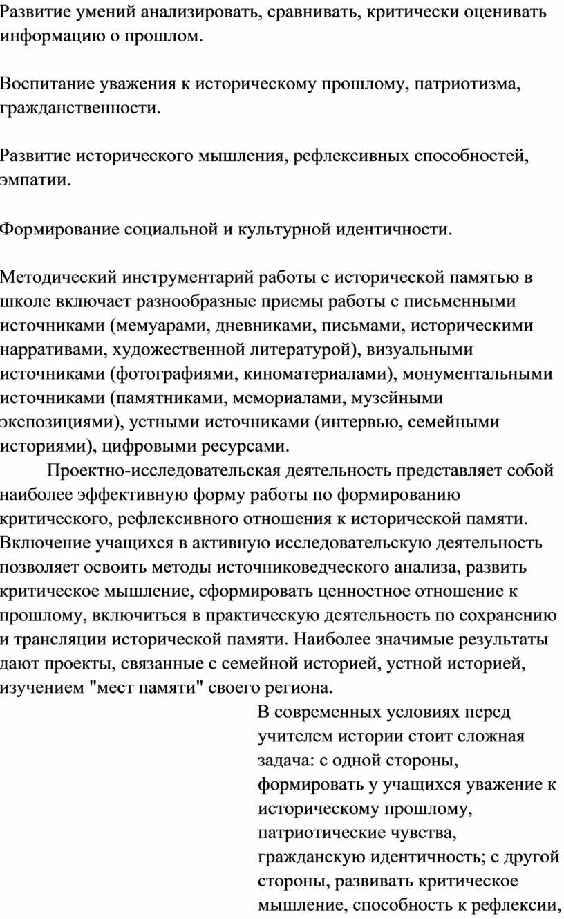 социализирующих функций. Работа должна строиться на принципах научности, историзма, объективности, ценностного подхода, диалогичности, деятельностного подхода, возрастного соответствия. Методический инструментарий включает разнообразные приемы работы с письменными, визуальными, монументальными, устными и цифровыми источниками исторической памяти. Особую роль в формировании критического отношения к исторической памяти играет проектно-исследовательская деятельность, позволяющая учащимся освоить методы источниковедческого анализа, развить рефлексивные способности, включиться в практическую деятельность по сохранению и трансляции памяти.