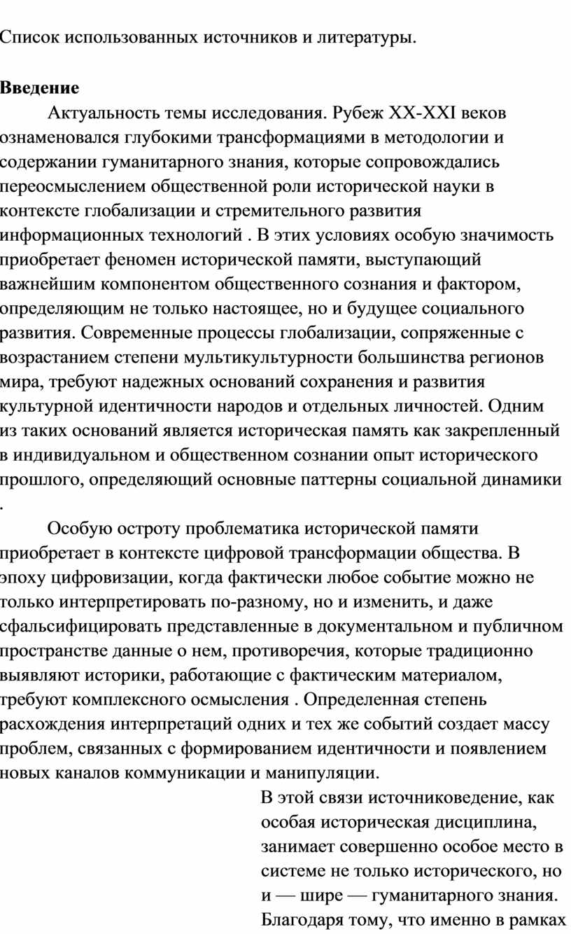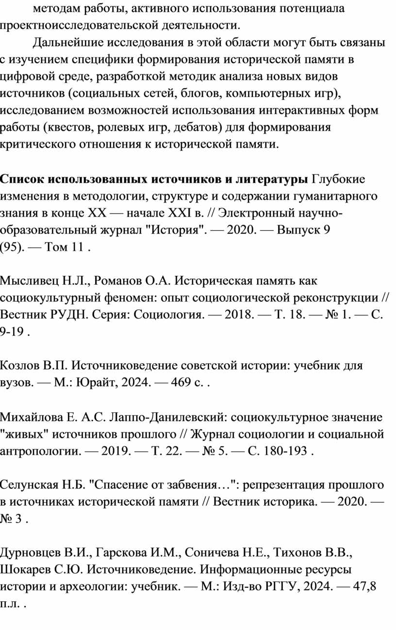 Список использованных источников и литературы Глубокие изменения в методологии, структуре и содержании гуманитарного знания в конце XX — начале XXI в. // Электронный научно-образовательный журнал "История". — 2020. — Выпуск 9