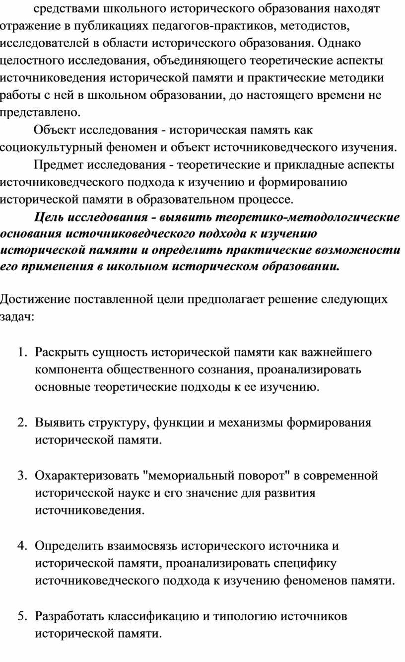 Цель исследования - выявить теоретико-методологические основания источниковедческого подхода к изучению исторической памяти и определить практические возможности его применения в школьном историческом образовании.