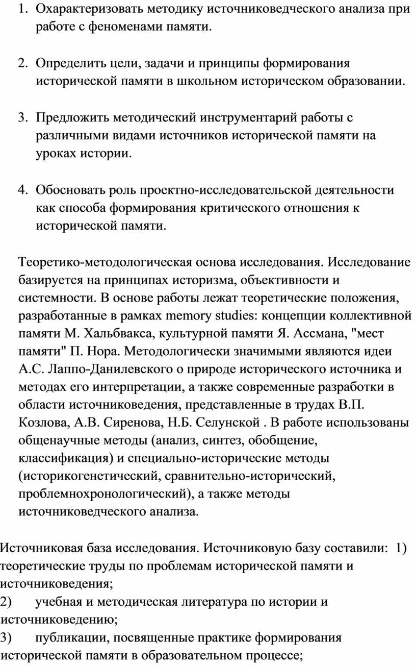 Теоретико-методологическая основа исследования. Исследование базируется на принципах историзма, объективности и системности. В основе работы лежат теоретические положения, разработанные в рамках memory studies: концепции коллективной памяти М. Хальбвакса, культурной памяти Я. Ассмана, "мест памяти" П. Нора. Методологически значимыми являются идеи А.С. Лаппо-Данилевского о природе исторического источника и методах его интерпретации, а также современные разработки в области источниковедения, представленные в трудах В.П. Козлова, А.В. Сиренова, Н.Б. Селунской . В работе использованы общенаучные методы (анализ, синтез, обобщение, классификация) и специально-исторические методы (историкогенетический, сравнительно-исторический, проблемнохронологический), а также методы источниковедческого анализа.