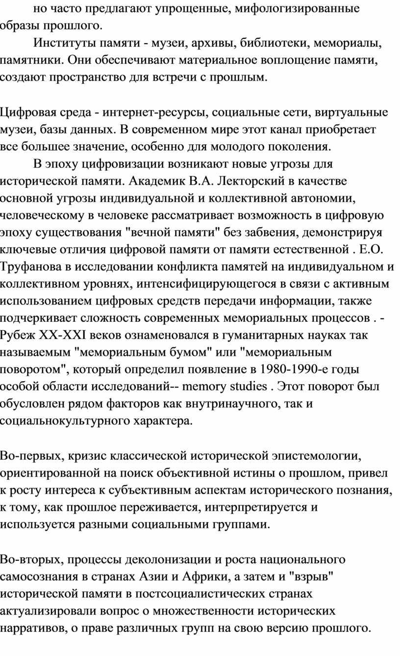 Таким образом, историческая память представляет собой сложный, многоуровневый феномен, находящийся на пересечении истории, культуры, психологии и социальных практик. Ее изучение требует междисциплинарного подхода, интегрирующего методологический инструментарий различных отраслей социогуманитарного знания.