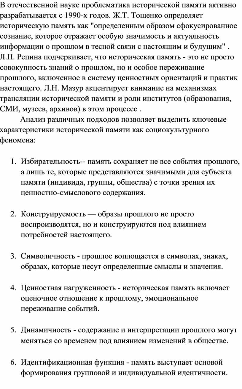 Л.П. Репина подчеркивает, что историческая память - это не просто совокупность знаний о прошлом, но и особое переживание прошлого, включенное в систему ценностных ориентаций и практик настоящего. Л.Н. Мазур акцентирует внимание на механизмах трансляции исторической памяти и роли институтов (образования, СМИ, музеев, архивов) в этом процессе .