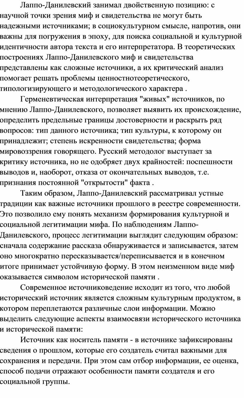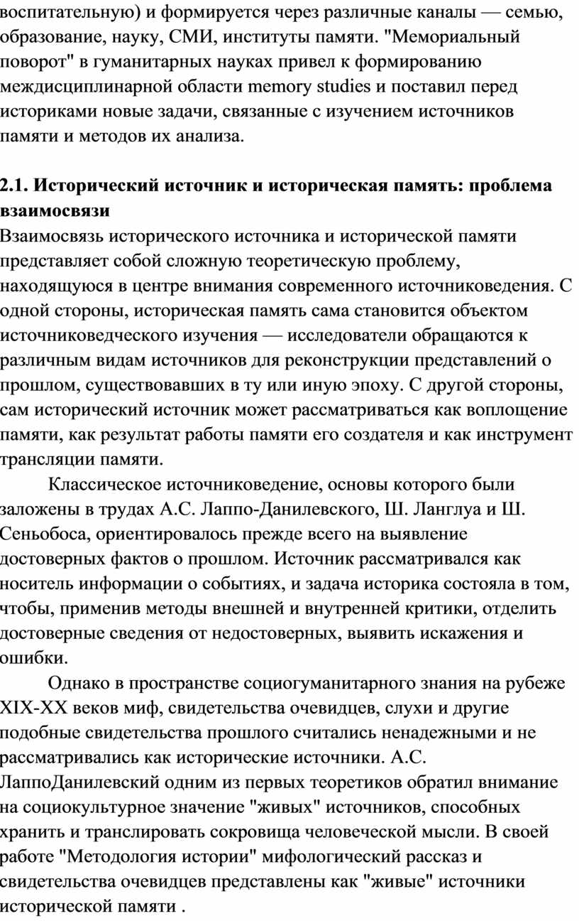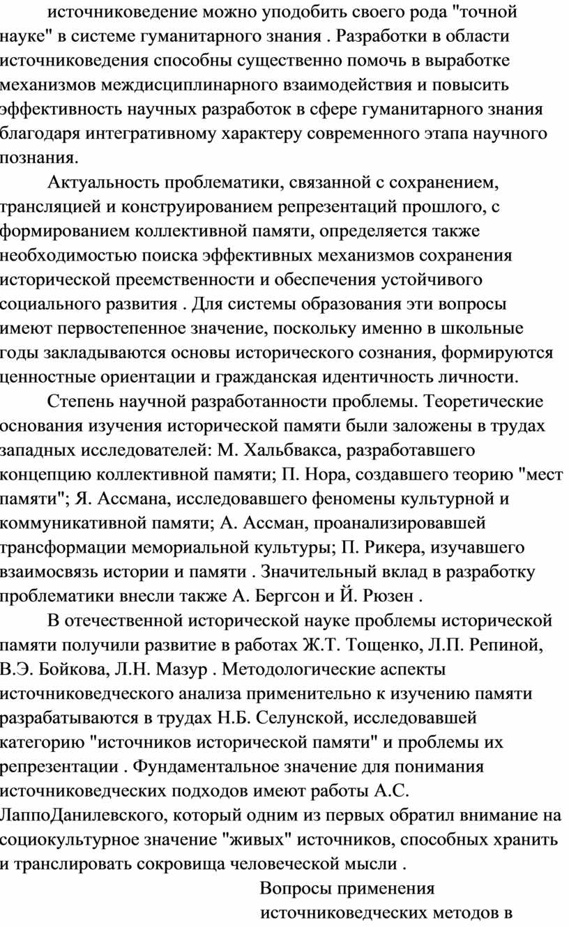 В отечественной исторической науке проблемы исторической памяти получили развитие в работах Ж.Т. Тощенко, Л.П. Репиной, В.Э. Бойкова, Л.Н. Мазур . Методологические аспекты источниковедческого анализа применительно к изучению памяти разрабатываются в трудах Н.Б. Селунской, исследовавшей категорию "источников исторической памяти" и проблемы их репрезентации . Фундаментальное значение для понимания источниковедческих подходов имеют работы А.С. ЛаппоДанилевского, который одним из первых обратил внимание на социокультурное значение "живых" источников, способных хранить и транслировать сокровища человеческой мысли .