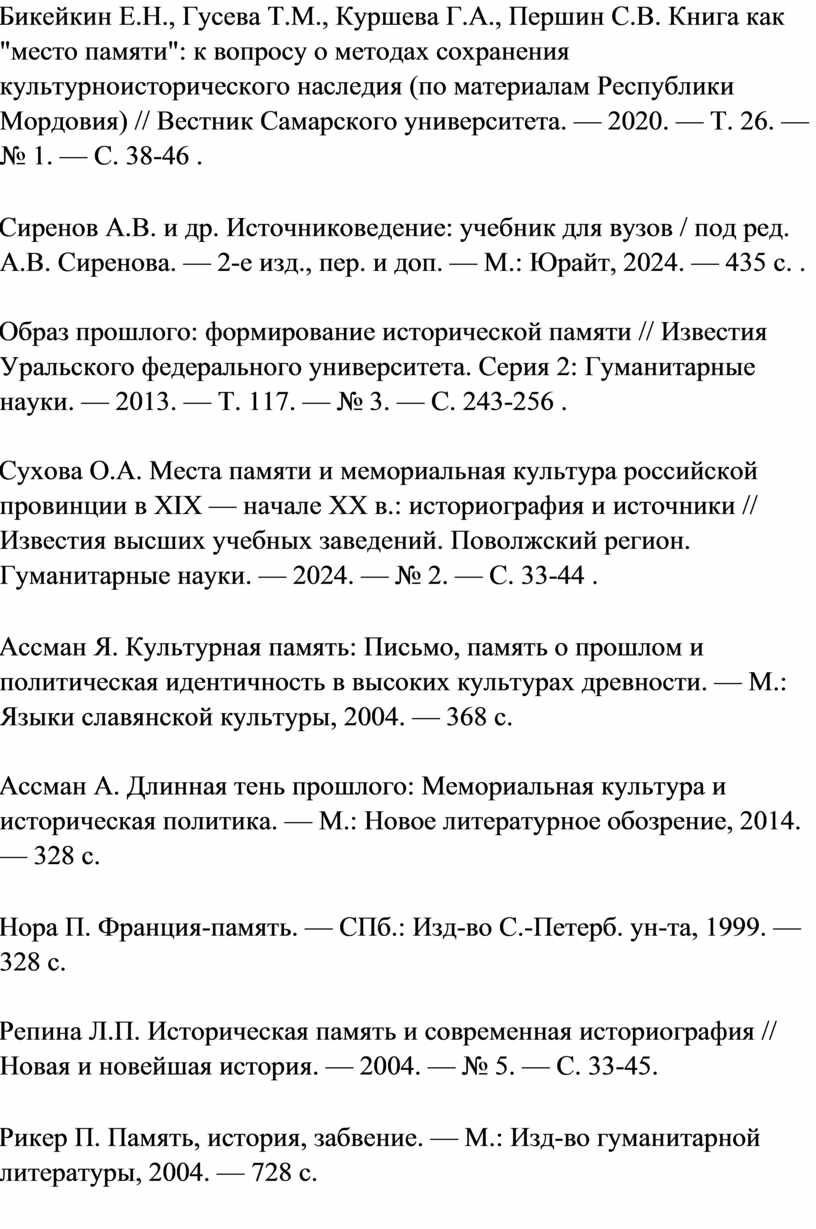 Бикейкин Е.Н., Гусева Т.М., Куршева Г.А., Першин С.В. Книга как "место памяти": к вопросу о методах сохранения культурноисторического наследия (по материалам Республики Мордовия) // Вестник Самарского университета. — 2020. — Т. 26. — № 1. — С. 38-46 .