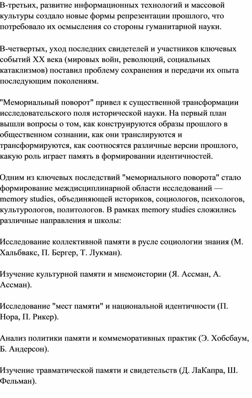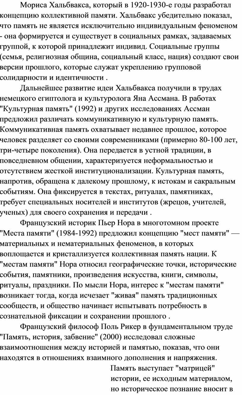 Степень научной разработанности проблемы. Теоретические основания изучения исторической памяти были заложены в трудах западных исследователей: М. Хальбвакса, разработавшего концепцию коллективной памяти; П. Нора, создавшего теорию "мест памяти"; Я. Ассмана, исследовавшего феномены культурной и коммуникативной памяти; А. Ассман, проанализировавшей трансформации мемориальной культуры; П. Рикера, изучавшего взаимосвязь истории и памяти . Значительный вклад в разработку проблематики внесли также А. Бергсон и Й. Рюзен .