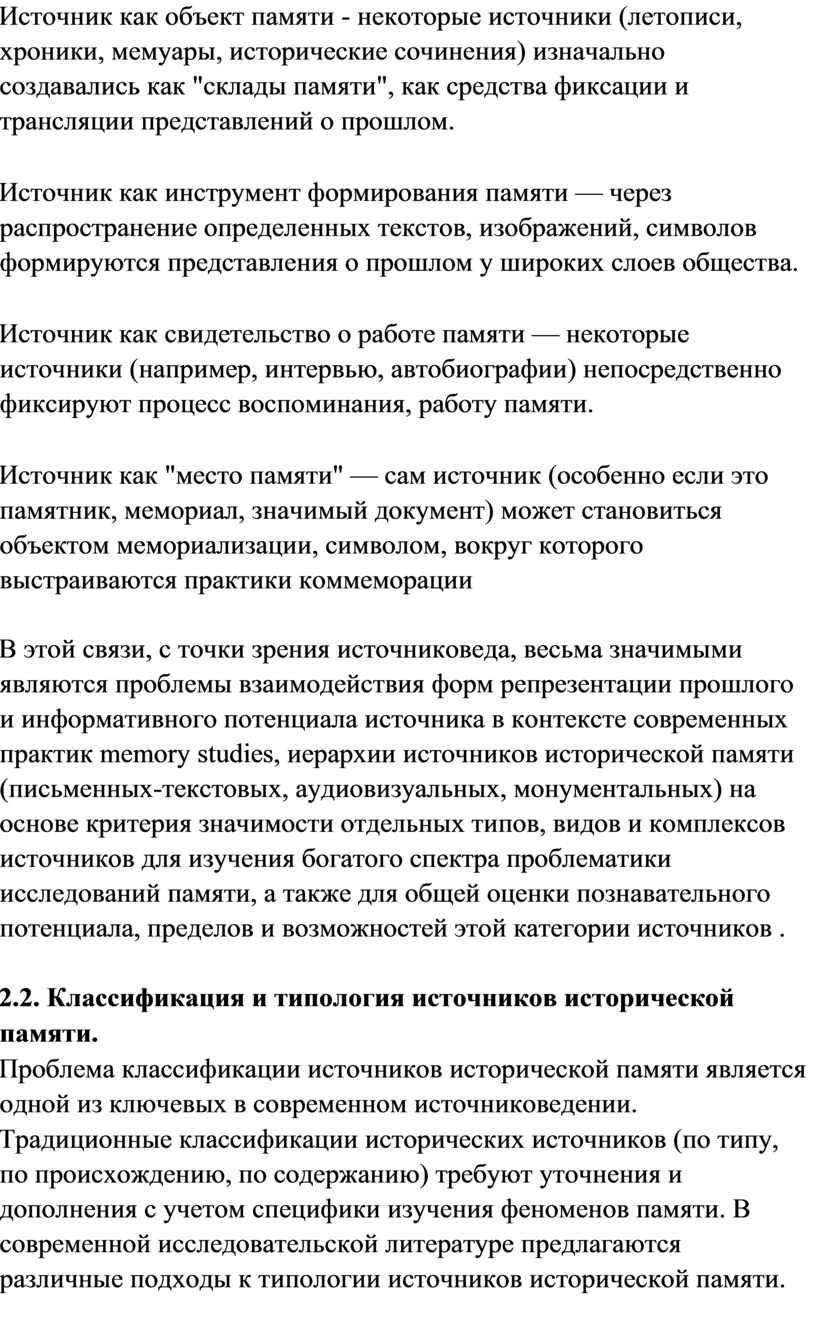 2.2. Классификация и типология источников исторической памяти 2.3. Методика источниковедческого анализа при работе с феноменами памяти.