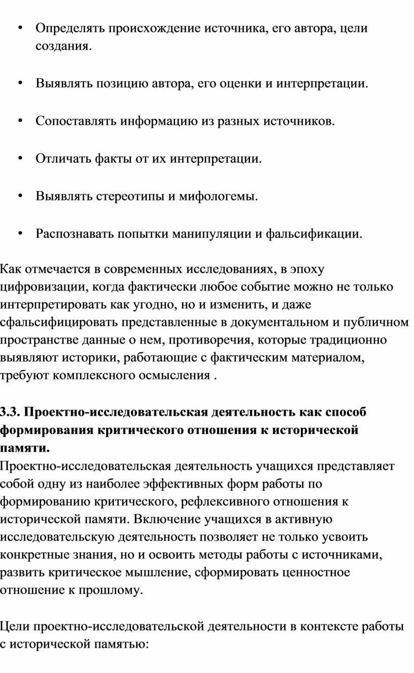 3.3. Проектно-исследовательская деятельность как способ формирования критического отношения к исторической памяти.