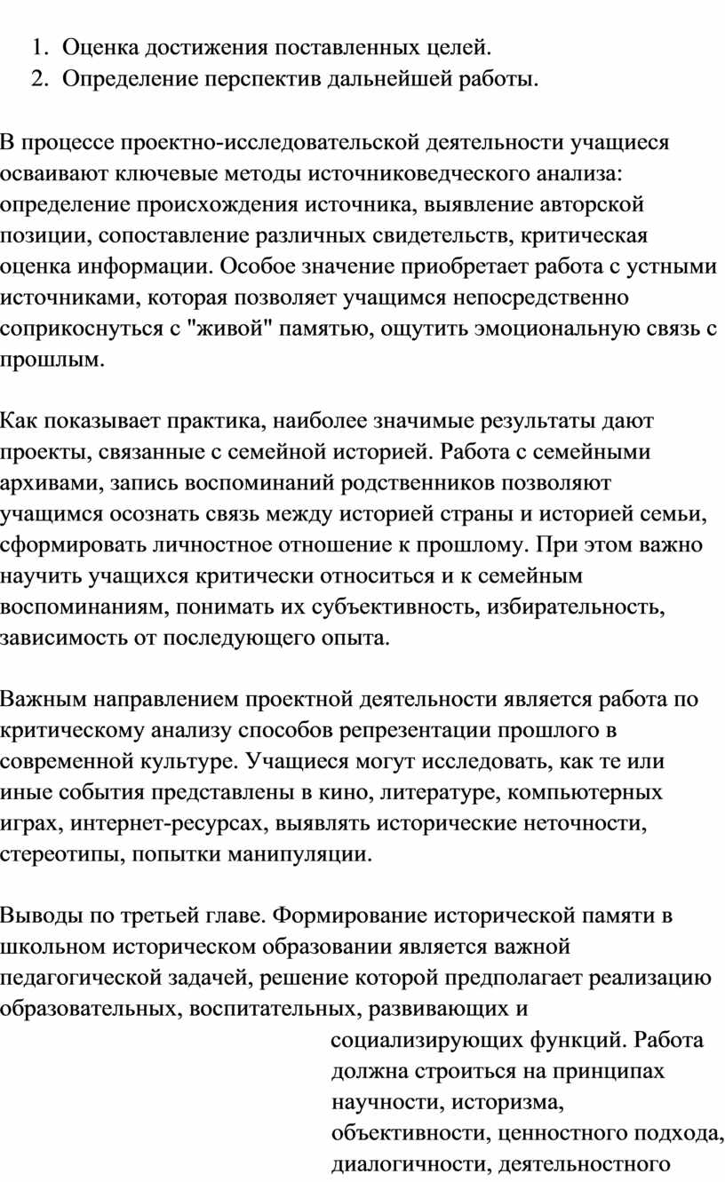 Выводы по третьей главе. Формирование исторической памяти в школьном историческом образовании является важной педагогической задачей, решение которой предполагает реализацию образовательных, воспитательных, развивающих и